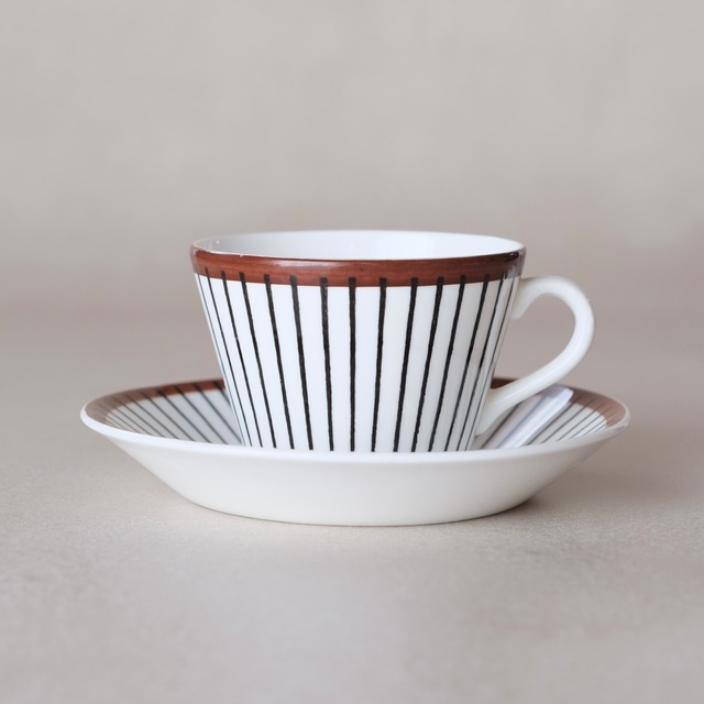 ▶︎商品説明 スウェーデン・グスタフスベリ社で製造された、 Spisa Ribb(スピサ リブ)シリーズの コーヒーカップ&ソーサーです。 1955年、スウェーデン・ヘルシンボリで開催された 国際展覧会「H55」の目玉作品のひとつとして発表されました。 「Spisa」はスウェーデン語で "食べる"、"食事をする"という意味を持つ言葉。 単に栄養を摂るというよりも、 食事を味わい、楽しむといった ポジティブで温かみのあるニュアンスが含まれています。 「Ribb」は"棒"や"桟(さん)"を指し、細い線が並ぶ様子を表しています。 デザインを手がけたのは、 20世紀を代表するデザイナーのひとり、 Stig Lindberg(スティグ・リンドベリ)。 白地に引かれた黒い縦のストライプと、縁を巡るあたたかなブラウンのライン。 ごくシンプルな構成の中に、 すっきりとした佇まいと、さりげない品の良さが感じられます。 装飾は、リンドベリの手描きのデザインをもとに 転写によって施されていますが、 黒い縦のラインには、太さやにじみ、間隔などにわずかな違いが見られます。 そうした揺らぎが、 どこか人の手の気配を感じさせる温かな表情を生み出しています。 均一に整いすぎないこのささやかなリズムも、意識してデザインされたように感じられます。 一般的なデミタスに近い小ぶりなコーヒーカップ。 濃いめに淹れたコーヒーを、 ゆっくりと味わう時間に似合います。 注いだコーヒーがカップの中ですっと映え、 佇まいがいっそう引き立って見えるのも魅力のひとつ。 飲みものと器が、 自然に調和する心地よさを感じられる一客です。 ※Spisa Ribbは現在復刻生産されていますが、こちらは1950年代〜70年代に製造されたオリジナルのヴィンテージ品です。 ※ヘルシンボリ国際博覧会(H55) 1955年に、スウェーデン南部の港町ヘルシンボリで開催された国際博覧会です。 北欧諸国をはじめ、フランス、西ドイツ、スイス、イギリス、日本など 約10カ国が参加しました。 第二次世界大戦後のスウェーデンが目指した 「新しい暮らしのかたち」を、建築や工業デザイン、日用品を通して 国内外に示すことを目的とした博覧会で、 戦後の北欧デザイン(スカンジナビア・モダン)が 世界的に注目される重要な転機となりました。 このSpisa Ribbのほかにも、 アルヴァ・アアルトのデザイン事務所による幾何学模様のテキスタイル「H55」など、現在も愛され続ける名作が数多く生み出されています。 ▶︎デザイナー Stig Lindberg(スティグ・リンドベリ) ▶︎メーカー Gustavsberg(グスタフスベリ) ▶︎製造国 スウェーデン ▶︎製造期間 1955年〜1974年 ▶︎サイズ カップ:飲み口Φ7.5cm、底部Φ4.8cm×高さ5.5cm ソーサー:Φ12.5cm×高さ2cm 容量(満水時):約140ml ▶︎コンディションランク:B 割れや欠けなど大きなダメージもなく、艶もあり良好なヴィンテージコンディションです。 ソーサーの縁の一部に、焼成時に釉薬がかからず素地がわずかに感じられる箇所が見られます。 また、ソーサー裏に支柱跡があります。 いずれも製造過程に由来するもので、欠けやヒビではなく、使用に差し支えるものではありません。 【コンディションランク 】 A デットストックなどの未使用品でダメージがほとんど無く新品同様のもの。 B 光に当てればわかるほどの少しの小傷やペイントロスなどあるが全体的に綺麗な状態のもの。 C 小傷などあり全体的に使用感は感じられるが、深い傷など目立つダメージがないもの。 D 光に当てなくてもダメージを確認することができるが、使用上問題のある割れや欠けなどはないもの。 E 目立つ傷や擦れ、割れや欠けなどがあり使用に問題があるもの。 ------------------------------------------------ ※送料60サイズ 全国一律760円 ※複数商品をご購入いただいた場合、同梱サイズによっては送料を調整ができる場合がございます。 ご希望がありましたら、ご購入前に商品ページ内「質問する」よりお気軽にご相談ください。