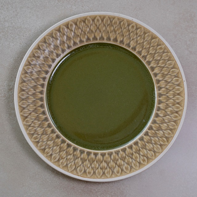 ▶︎商品説明 デンマークを代表するデザイナー Jens Harald Quistgaard(イェンス・ハラルド・クイストゴー) が手がけた、Relief(レリーフ)シリーズの21cmプレートです。 1950年代後半にデザインされ、1980年代まで長く作られ続けられた、 北欧ヴィンテージを代表するシリーズのひとつとして知られています。 「Relief」は、フランス語で浮き彫り、立体装飾を意味する言葉。 器の縁には、木の葉をモチーフにしたレリーフ模様が連なり、 彫刻のように静かに浮かび上がります。 釉薬の濃淡によって葉の輪郭が際立ち、 光の当たり方によってささやかに表情を変えるのも魅力です。 中央には深みのあるオリーブグリーンの釉薬が施され、 光沢のある仕上がりが、落ち着いた色合いの中で印象的なアクセントになっています。 北欧の自然を思わせる穏やかな佇まい。 静かな存在感のある一枚です。 21cmプレートは、朝食や軽めの食事、デザートプレートなどにも使いやすいサイズで、 料理をやさしく引き立ててくれます。 ※Reliefシリーズは、企業の統合に伴い Kronjyden(1959〜1971)、Nissen(1971〜1984)、Bing & Grøndahl (1984〜1988頃)の3社にわたって製造されました。 こちらのプレートには、Kronjyden社のバックスタンプが入っています。 ▶︎製造国 デンマーク ▶︎製造期間 1959年〜1988年頃 ▶︎サイズ Φ21cm×高さ2cm ▶︎コンディションランク:B〜C 割れや欠けなど大きなダメージのない、良好なヴィンテージコンディションです。 中央部は、光沢のある濃い色のため、光の加減によって小傷やスレ、カトラリー跡がやや目につきやすい印象があります。 【コンディションランク 】 A デットストックなどの未使用品でダメージがほとんど無く新品同様のもの。 B 光に当てればわかるほどの少しの小傷やペイントロスなどあるが全体的に綺麗な状態のもの。 C 小傷などあり全体的に使用感は感じられるが、深い傷など目立つダメージがないもの。 D 光に当てなくてもダメージを確認することができるが、使用上問題のある割れや欠けなどはないもの。 E 目立つ傷や擦れ、割れや欠けなどがあり使用に問題があるもの。 ------------------------------------------------ ※送料60サイズ 全国一律760円 ※複数商品をご購入いただいた場合、同梱サイズによっては送料を調整ができる場合がございます。 ご希望がありましたら、ご購入前に商品ページ内「質問する」よりお気軽にご相談ください。