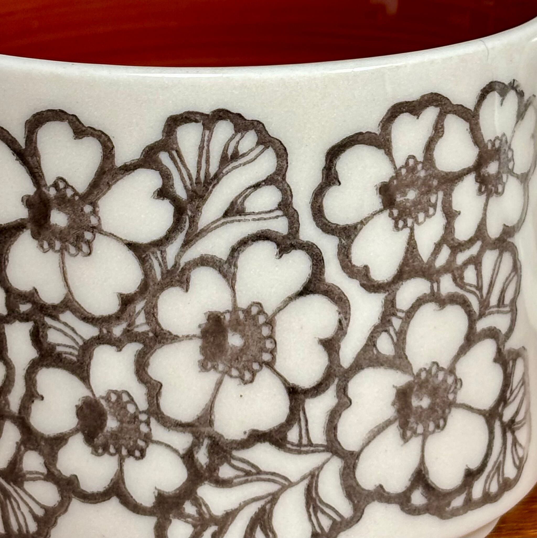 カップの側面いっぱいに可愛らしい花と葉がひしめき合うように描かれています。