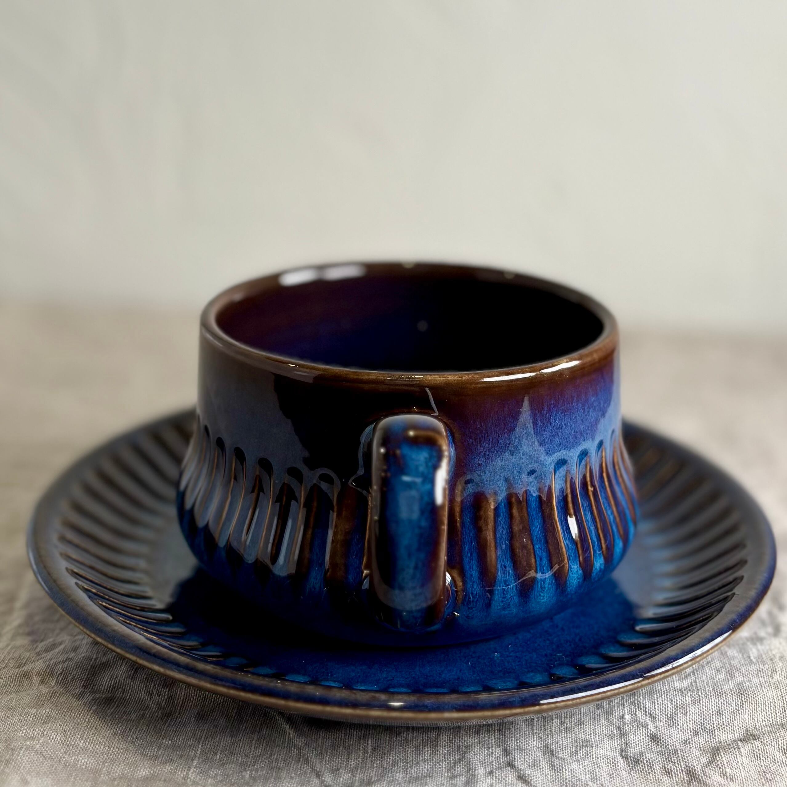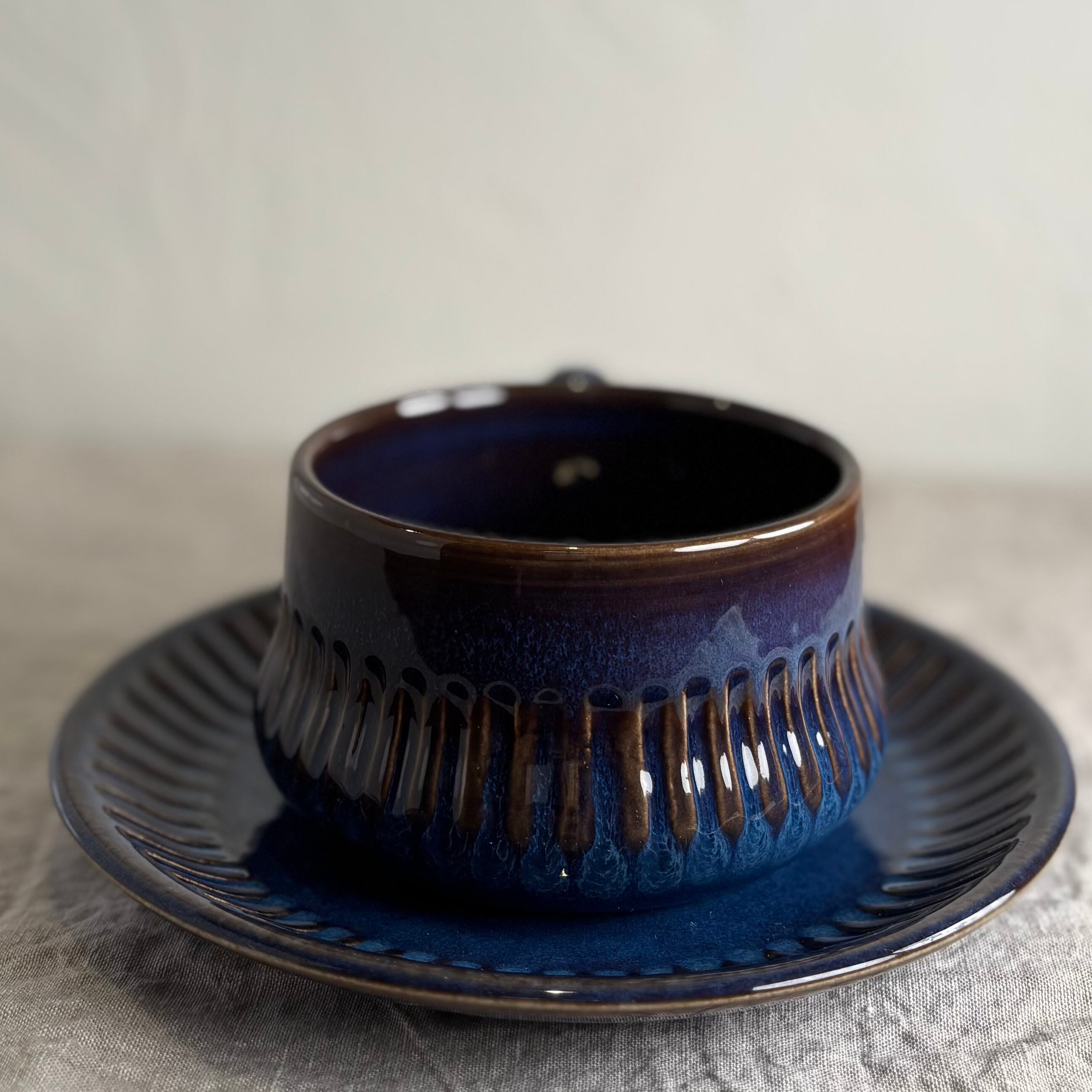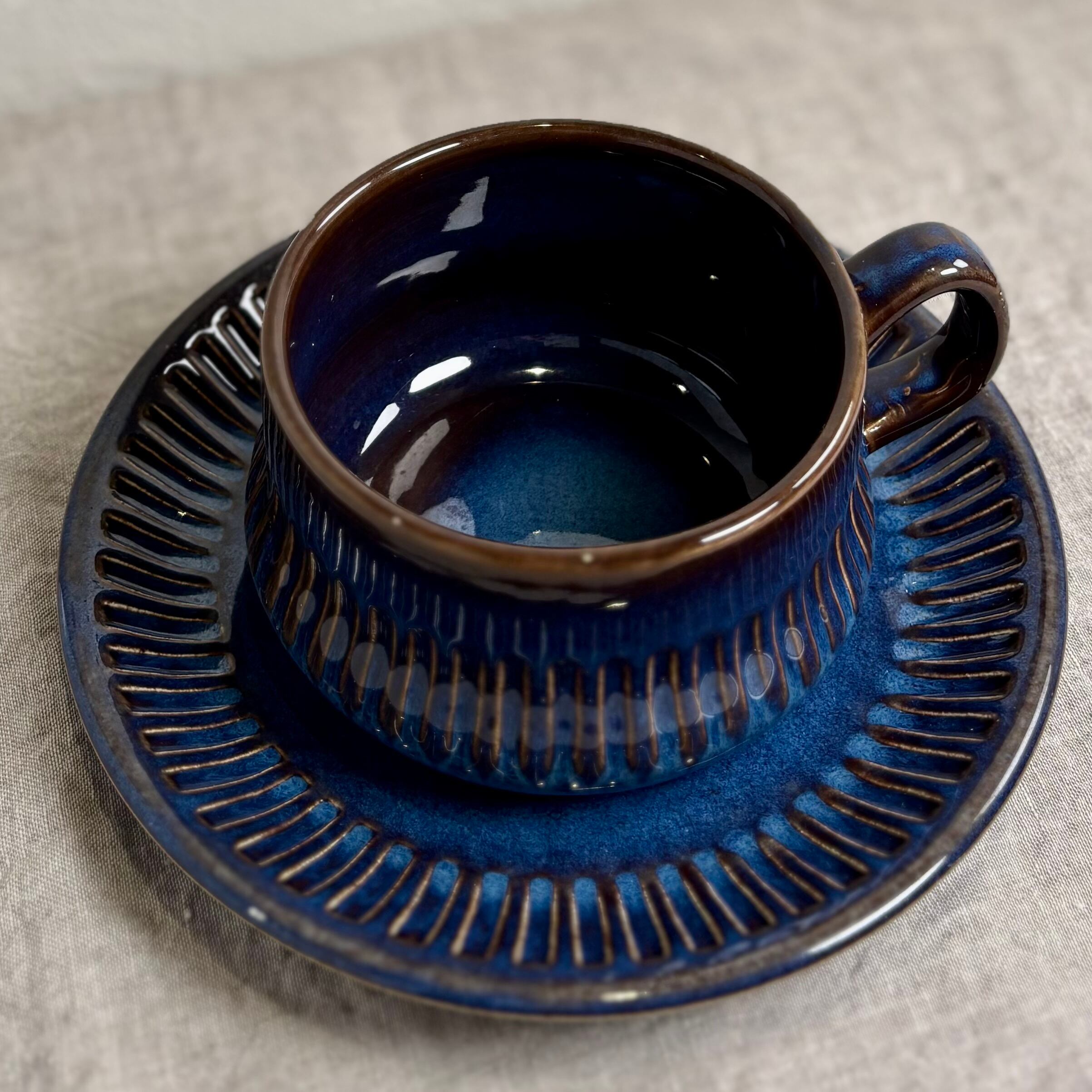 ブルーとブラウンが混ざり合った独特の色合いが大変美しく、深みのある一品です。釉薬のかかり方によって色合いや表情がそれぞれ違い、一つとして同じものはないといったところも、このシリーズの魅力です。