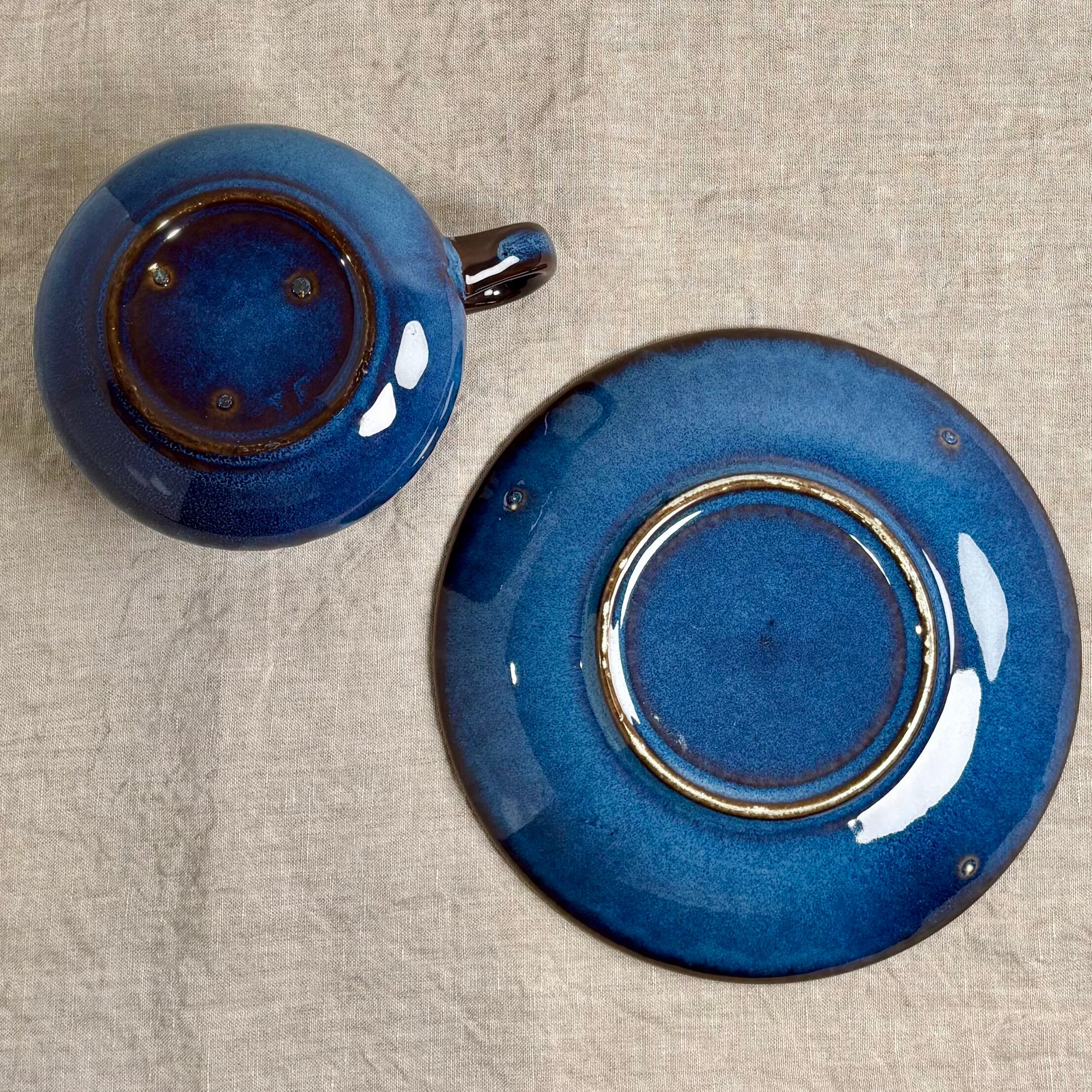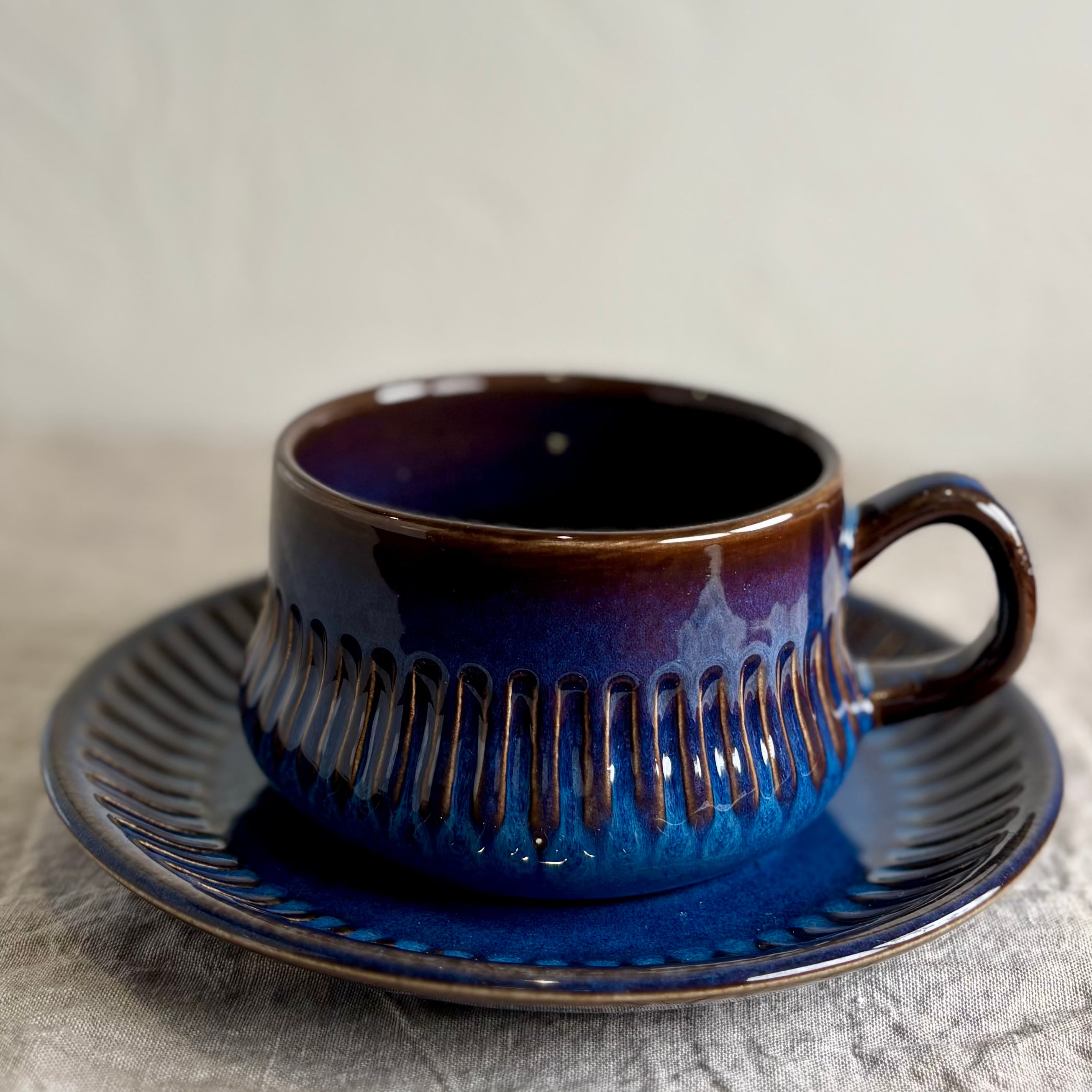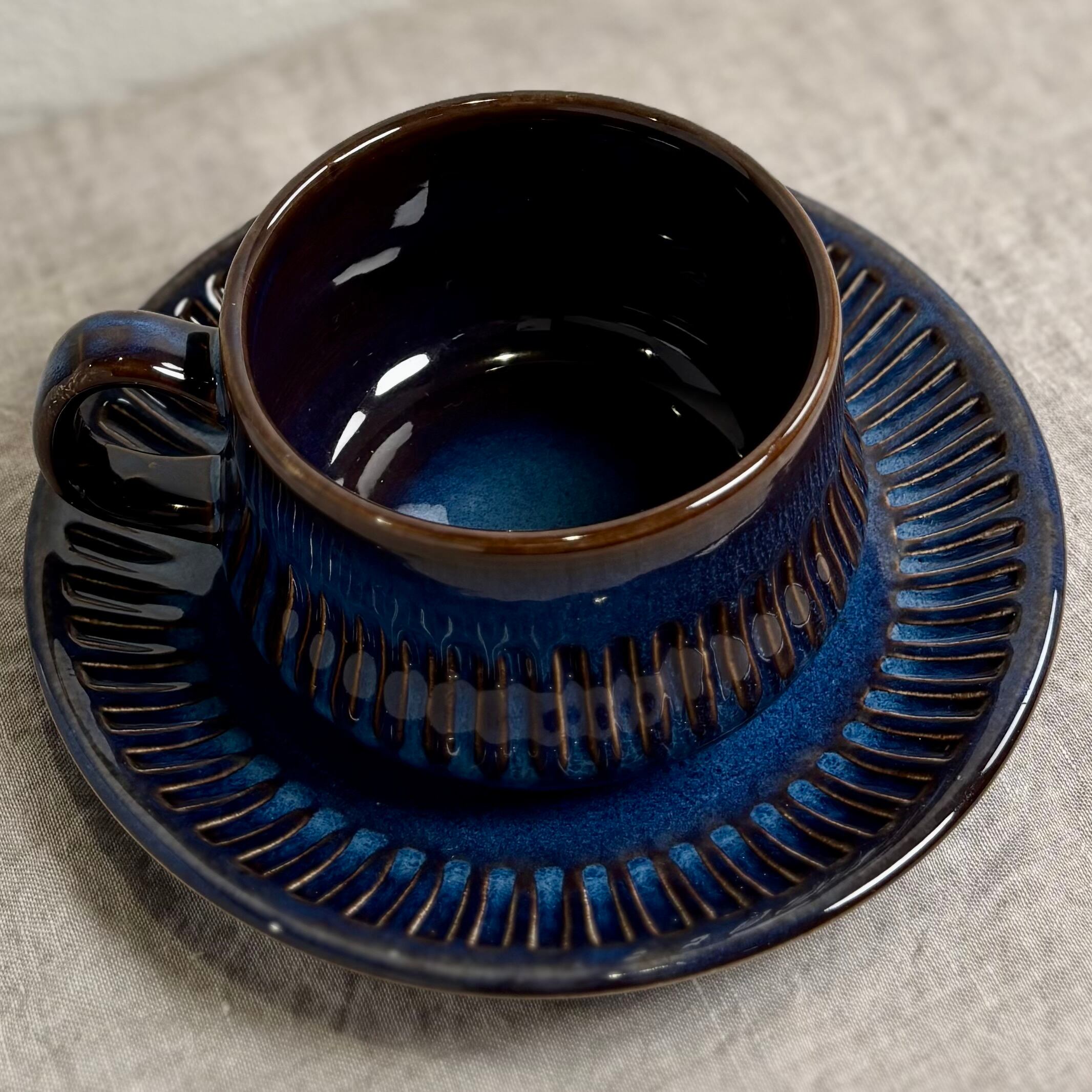 ブルーとブラウンが混ざり合った独特の色合いが大変美しく、深みのある一品です。釉薬のかかり方によって色合いや表情がそれぞれ違い、一つとして同じものはないといったところも、このシリーズの魅力です。