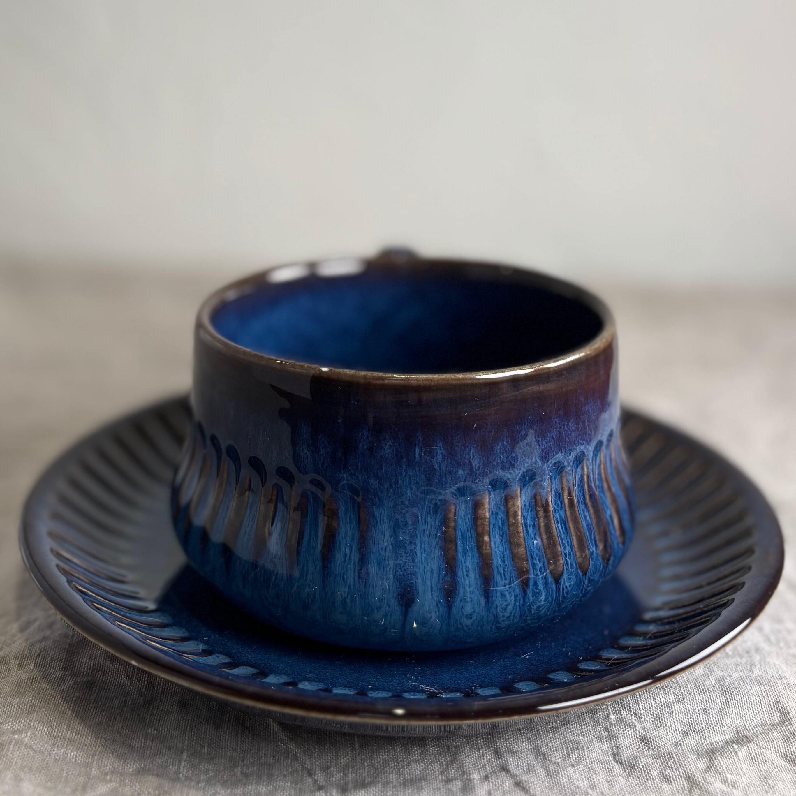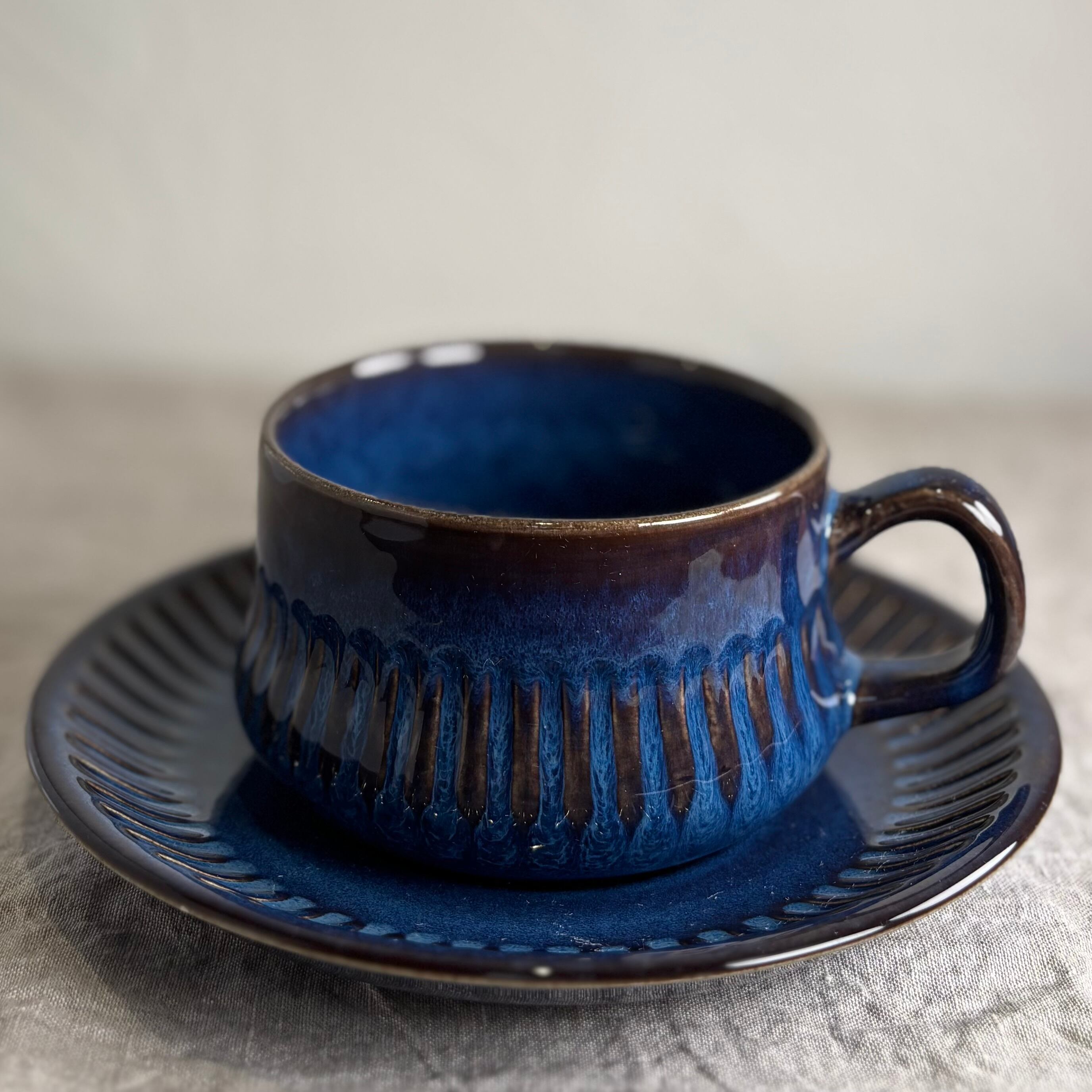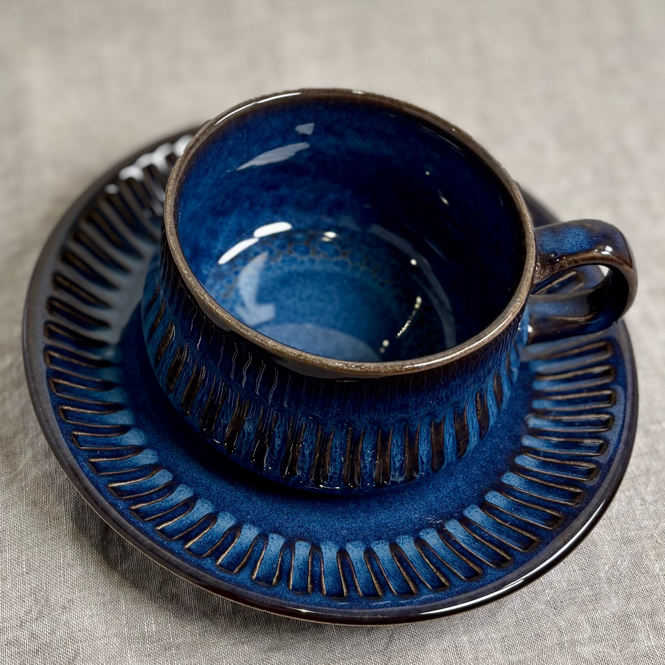 ブルーとブラウンが混ざり合った独特の色合いが大変美しく、深みのある一品です。釉薬のかかり方によって色合いや表情がそれぞれ違い、一つとして同じものはないといったところも、このシリーズの魅力です。