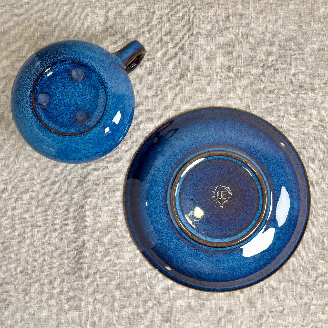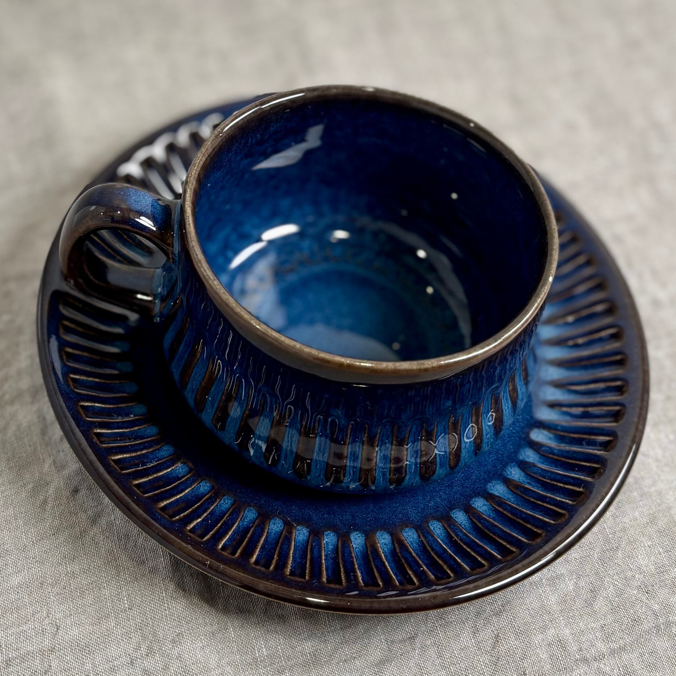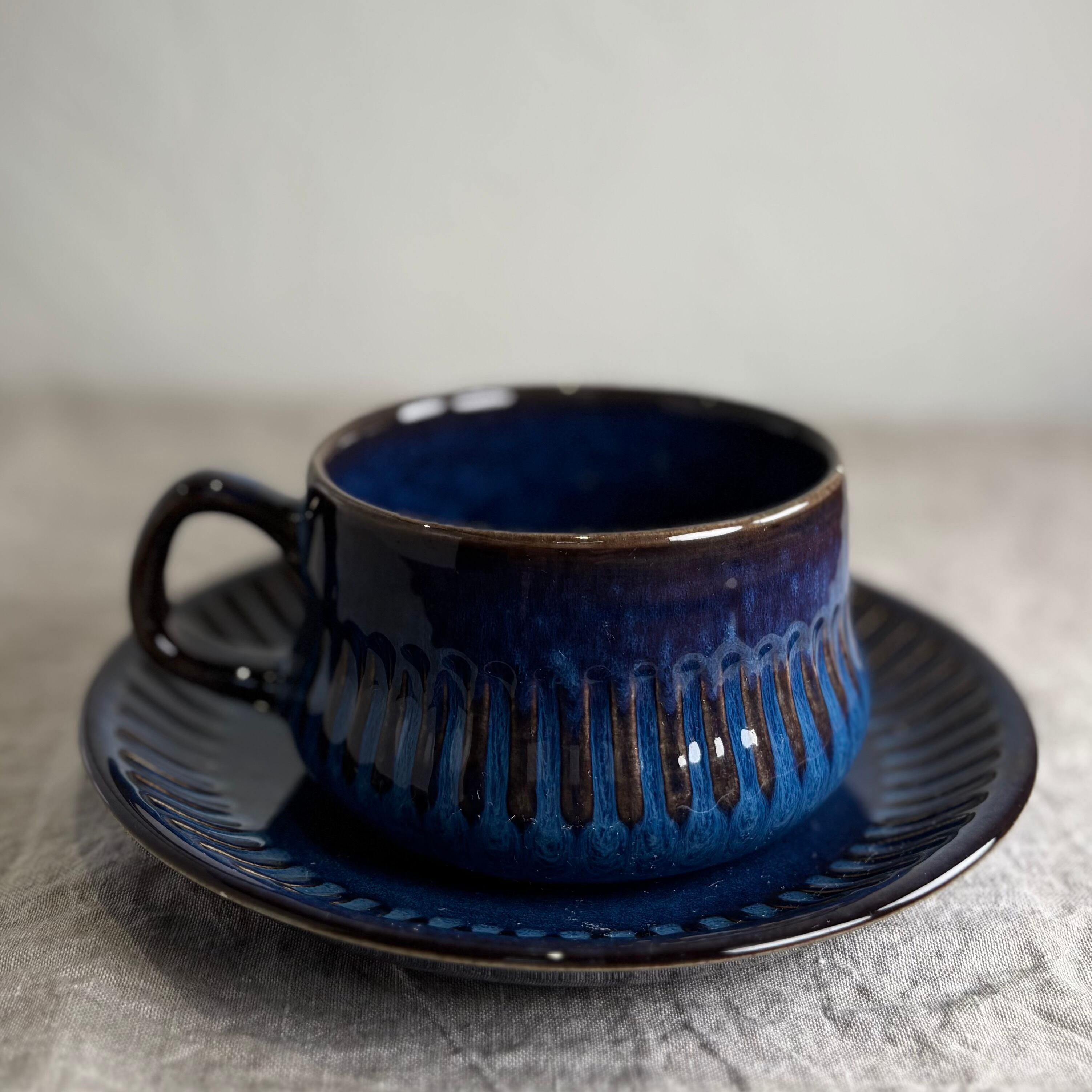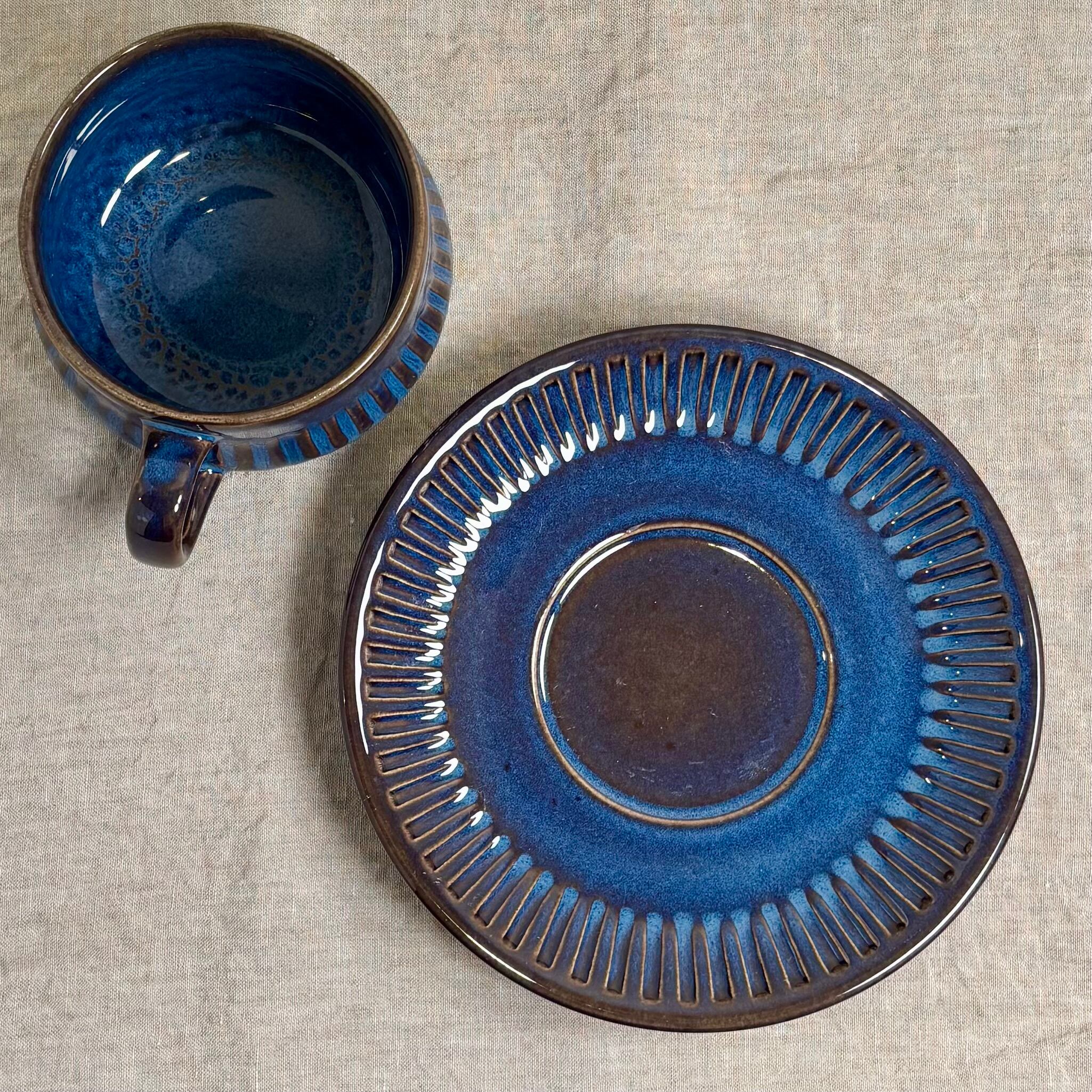ブルーとブラウンが混ざり合った独特の色合いが大変美しく、深みのある一品です。釉薬のかかり方によって色合いや表情がそれぞれ違い、一つとして同じものはないといったところも、このシリーズの魅力です。