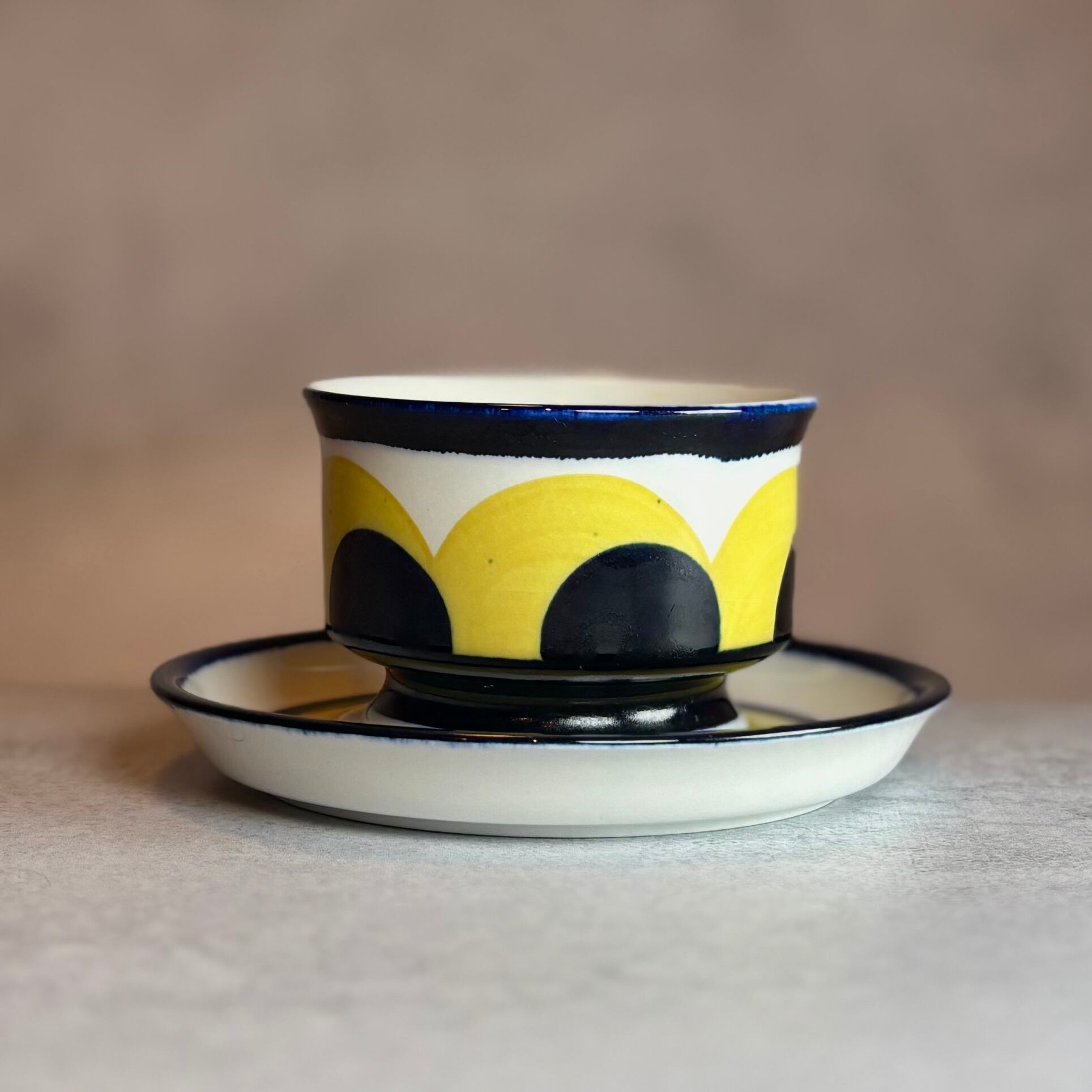 春の訪れを思わせるイエローと深いコバルトブルーの連なりは、職人の手描きによって一つひとつ丁寧に描かれており、わずかな揺らぎがやさしい温もりを添えています。