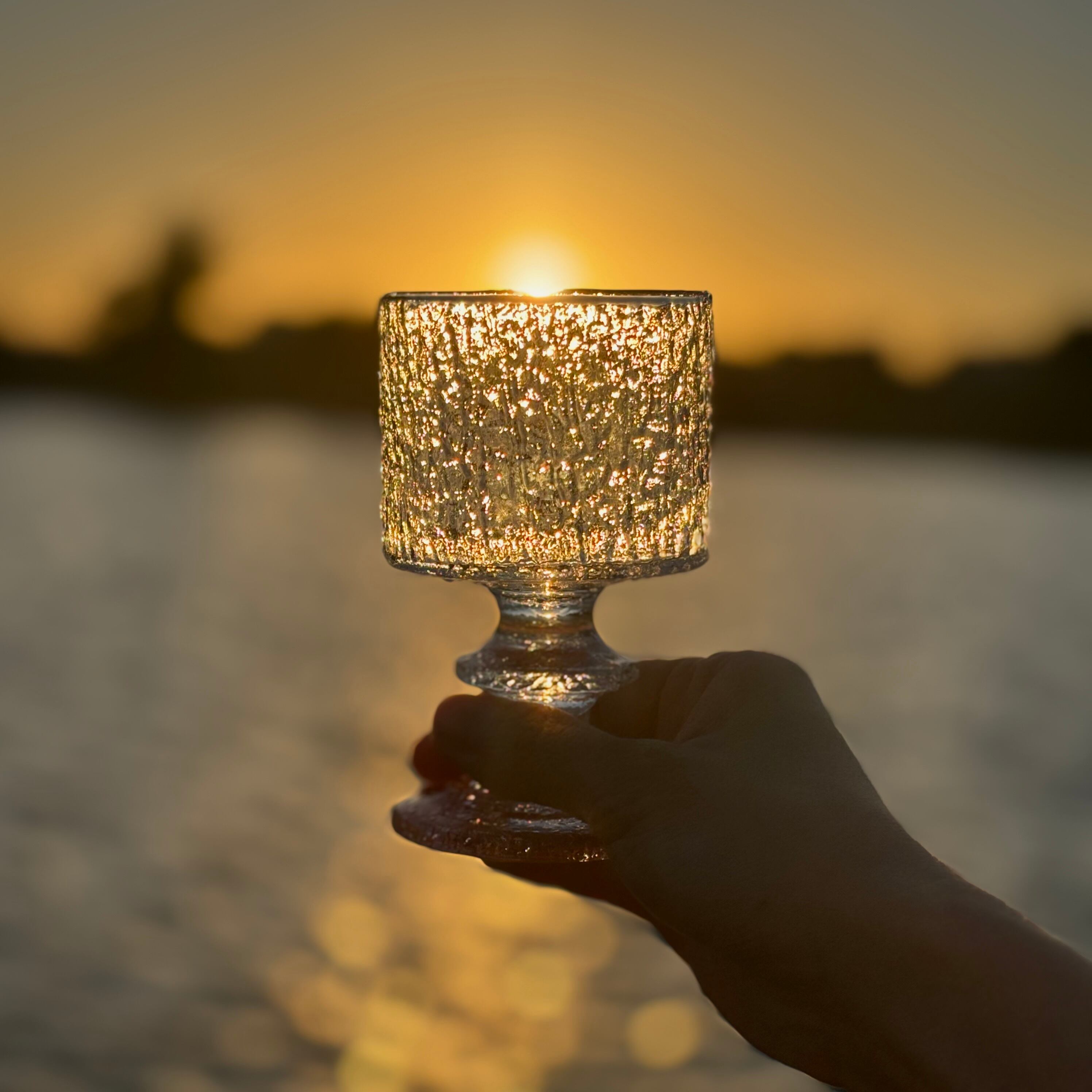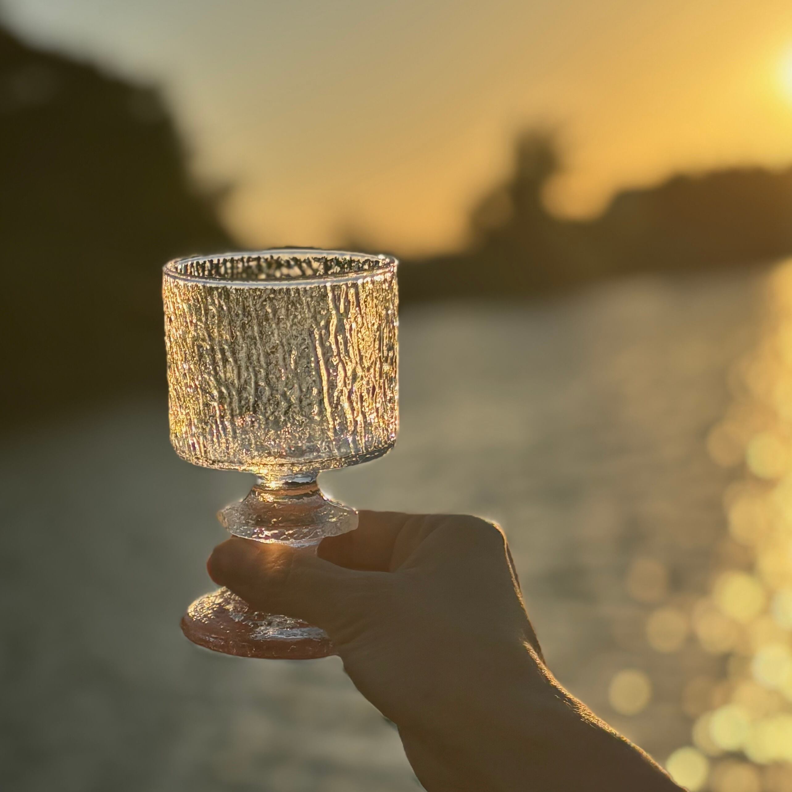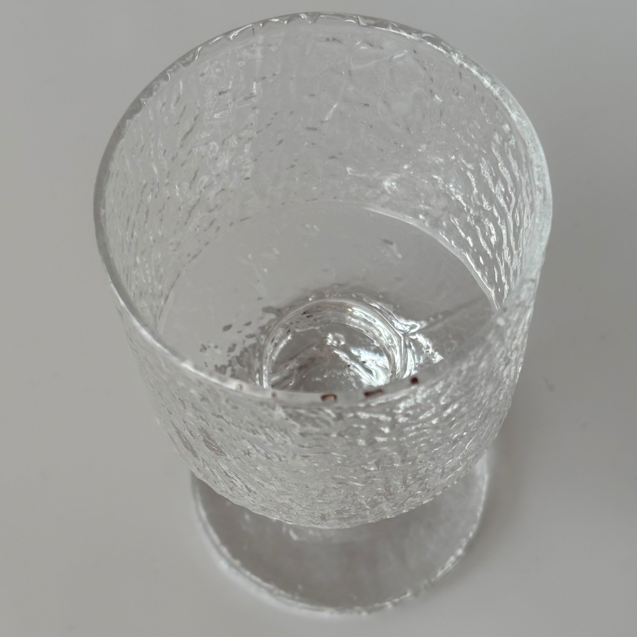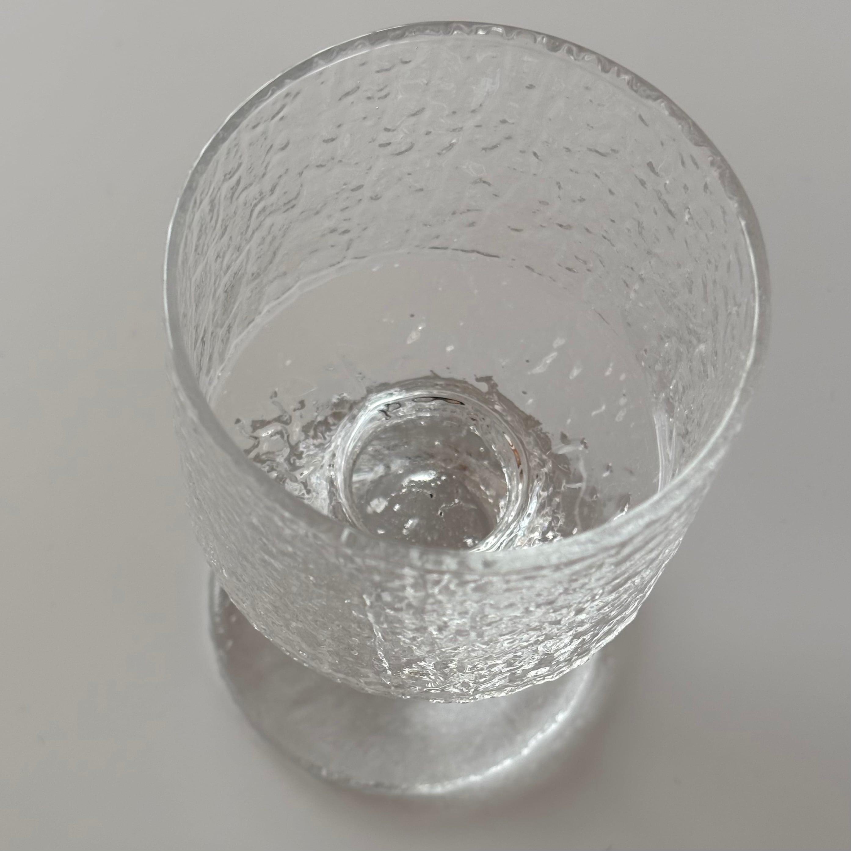 厚みのあるガラスに刻まれた独特の凹凸が光を柔らかく反射し、ワインを注いだときはもちろん、オブジェとして飾っても美しく穏やかな存在感を放ちます。