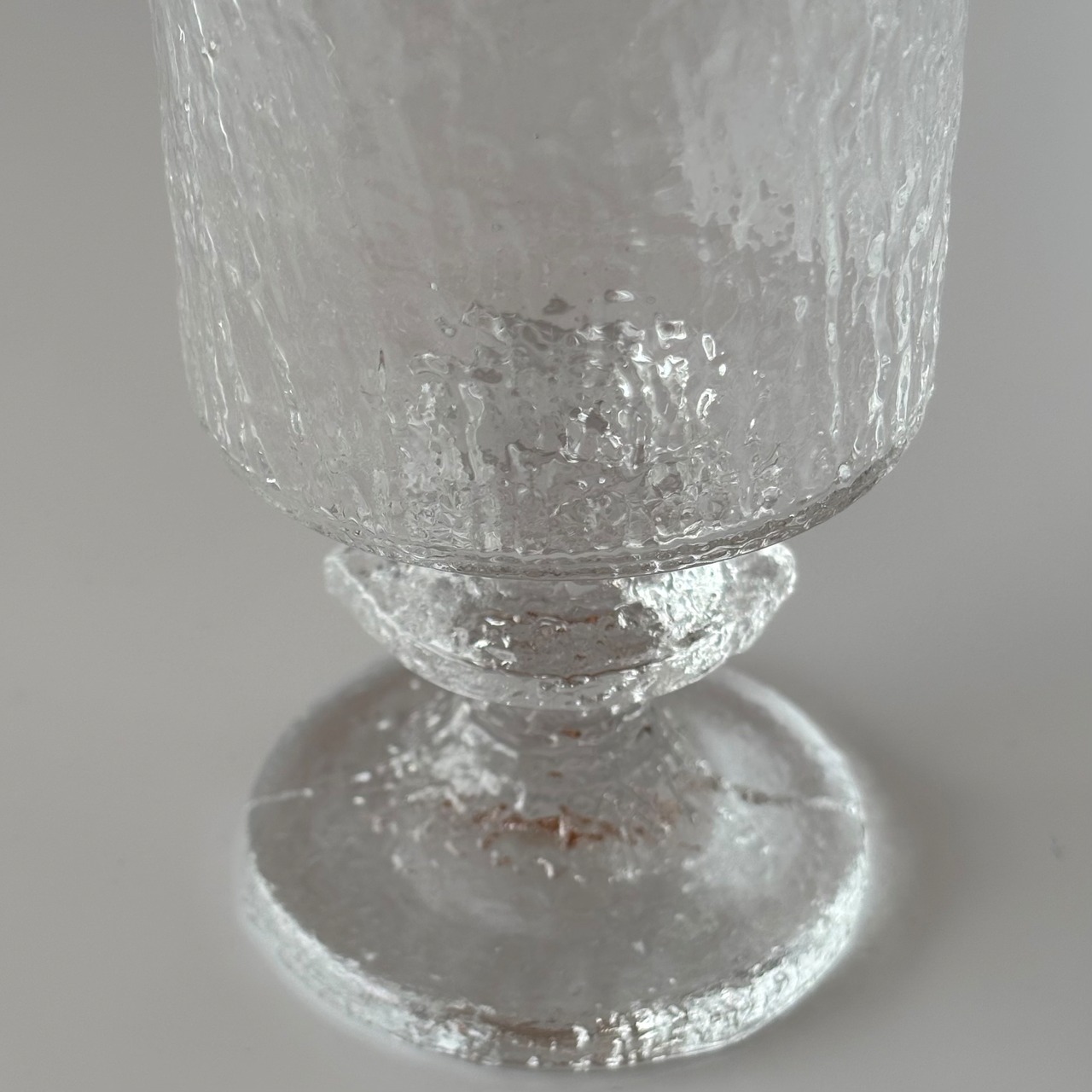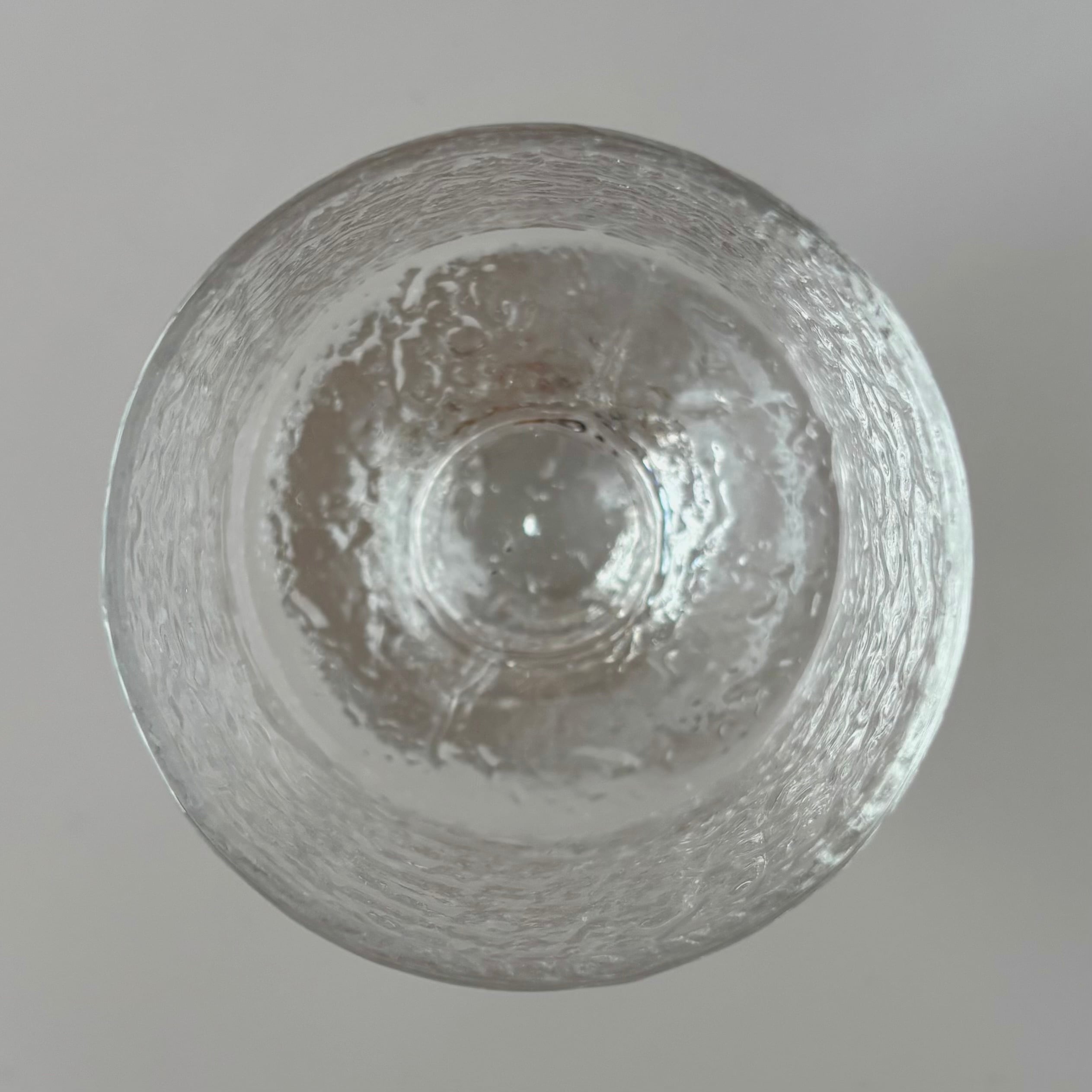 氷が溶けかける瞬間の光と質感を閉じ込めたような造形は、職人が型に吹き込んで成形するmould-blown(型吹きガラス)技法によって生み出されたものです。