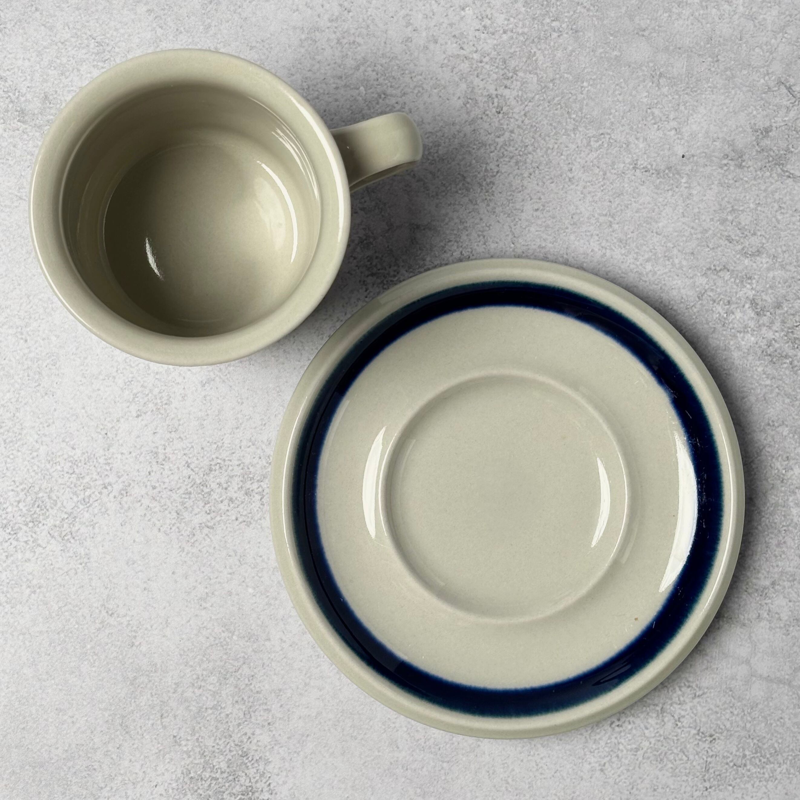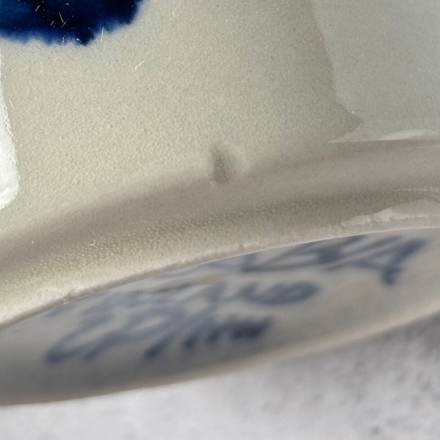 カップの高台近くにごく小さな欠けが見られます。釉薬が滑らかに残っているため、製造過程でできた小さな当たり(tiny chip)かもしれません。いずれにしても、使用には支障のない軽度な欠けの範囲です。