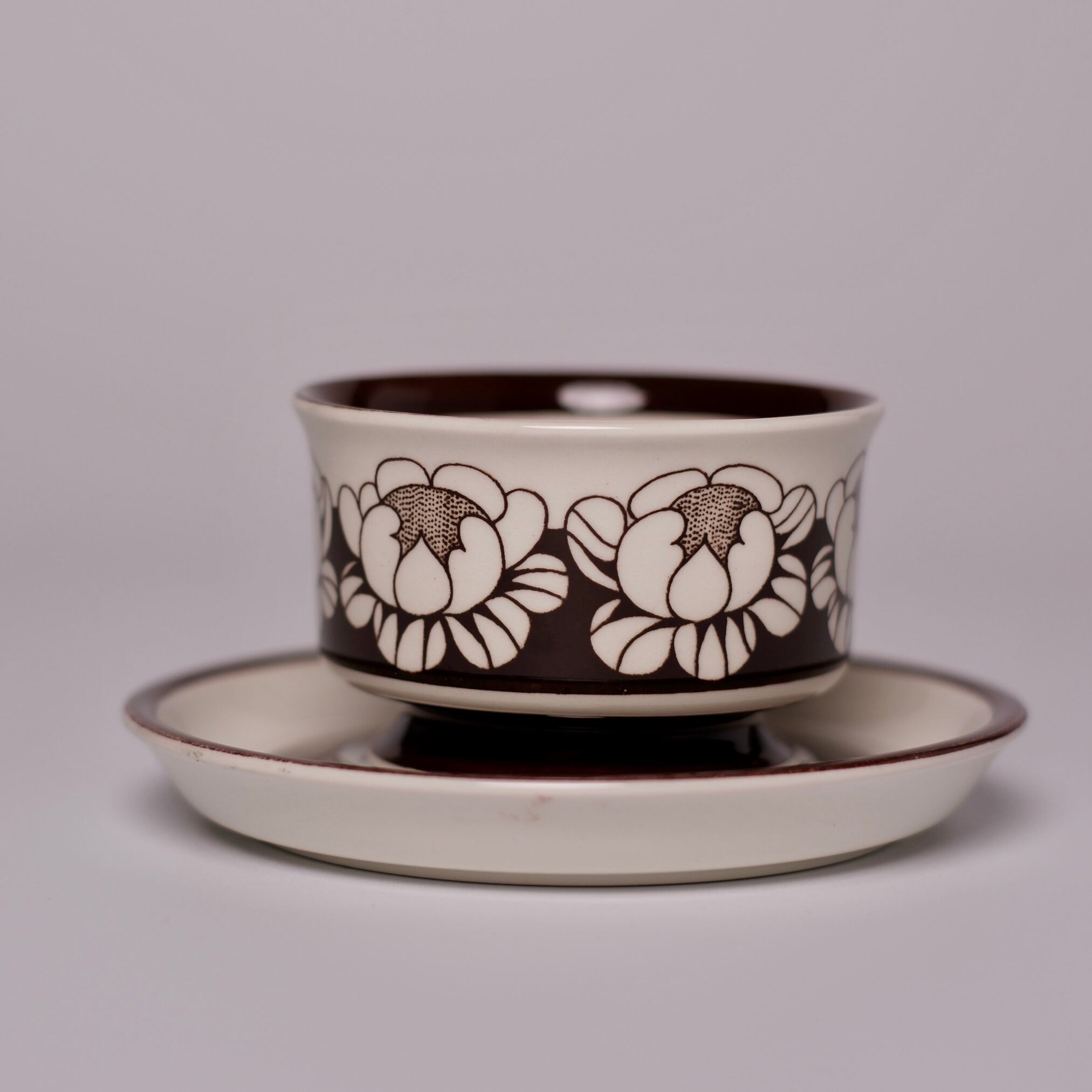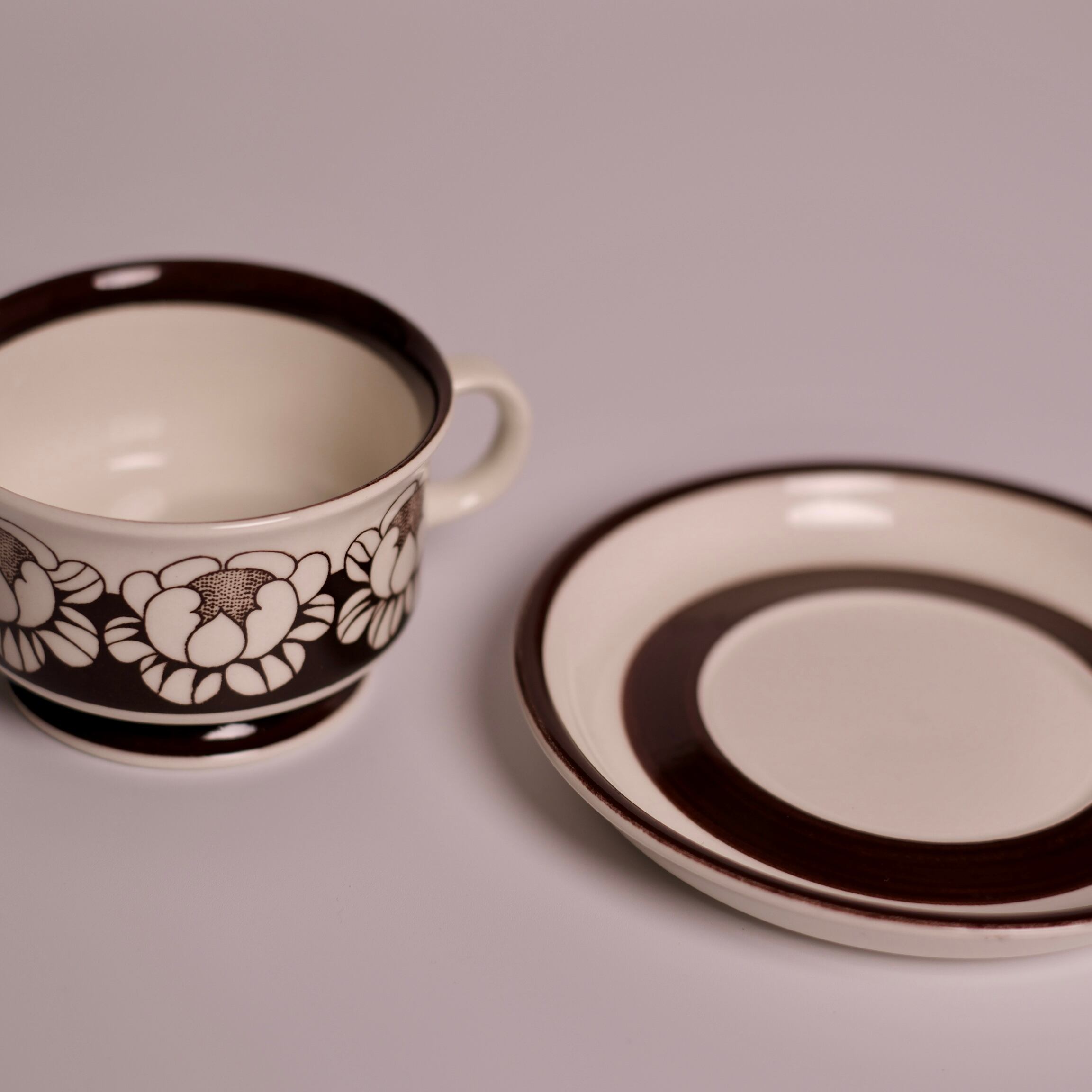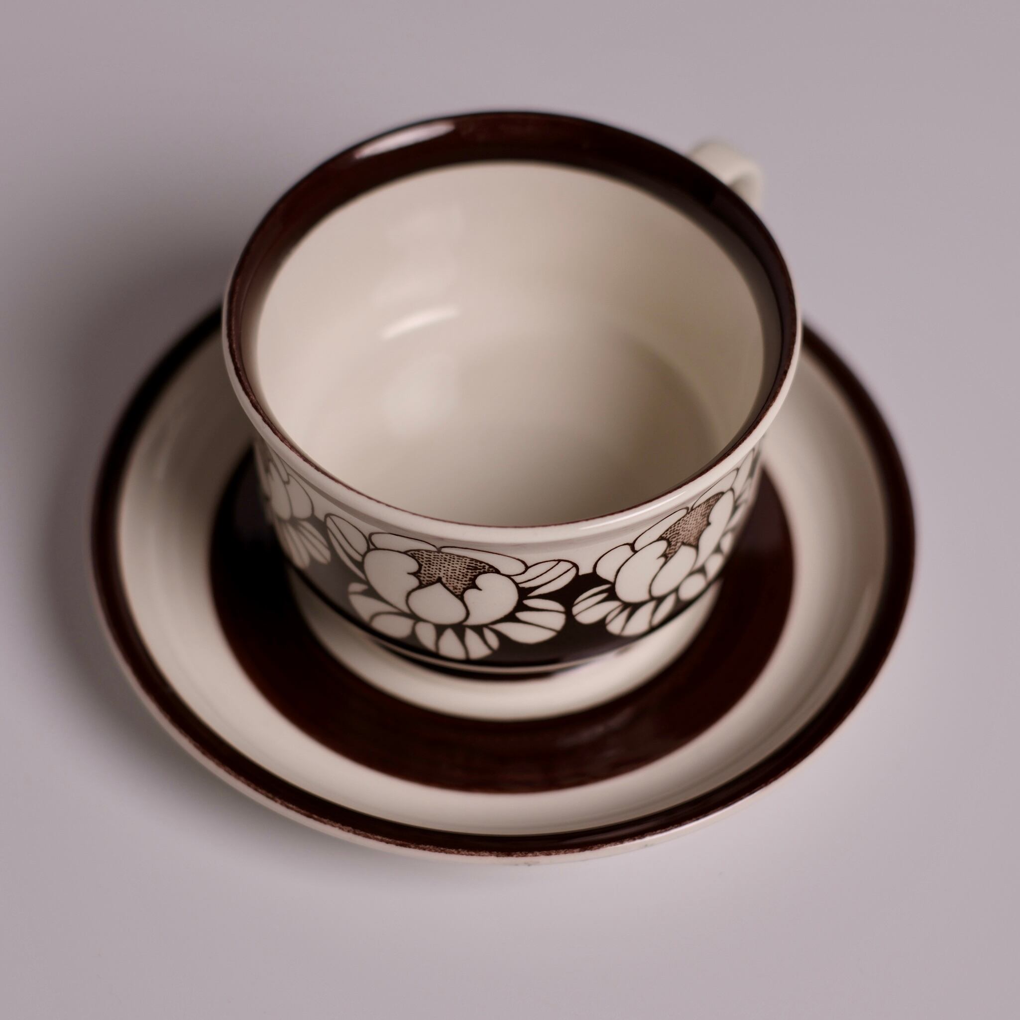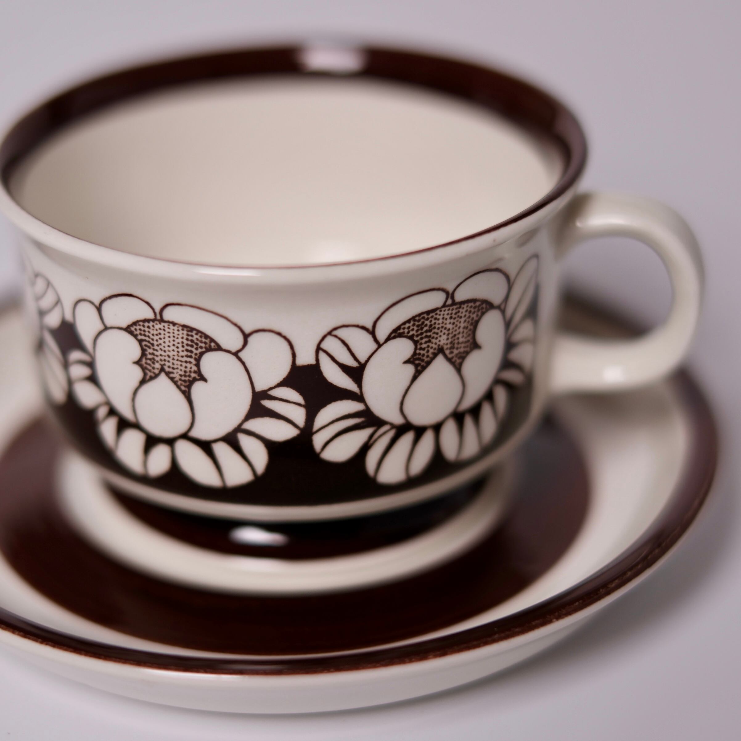 チョコレートブラウンで描かれた、ハスの花を思わせる大ぶりな花模様が印象的な、Katrilli(カトリーリ)のデミタスカップ&ソーサー。