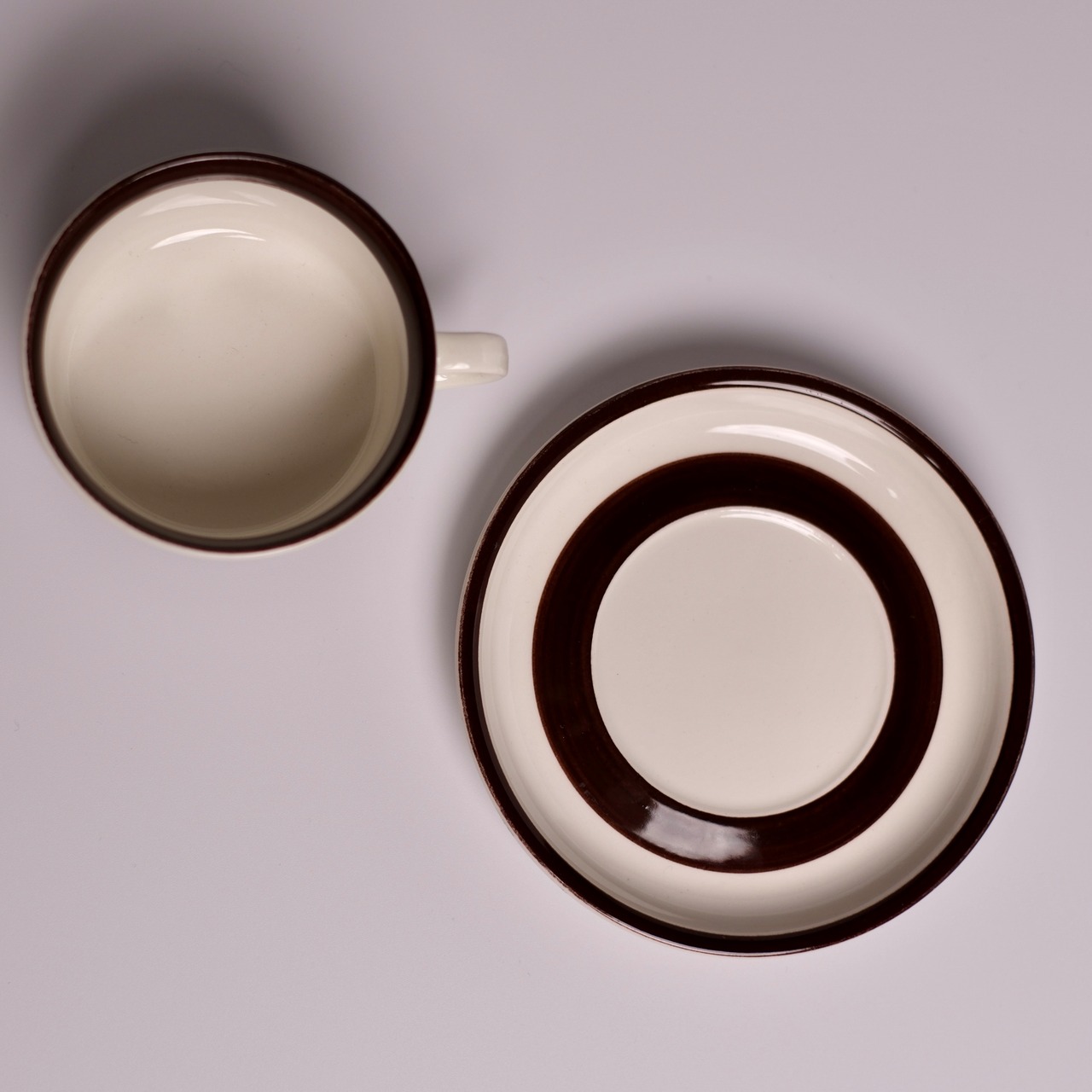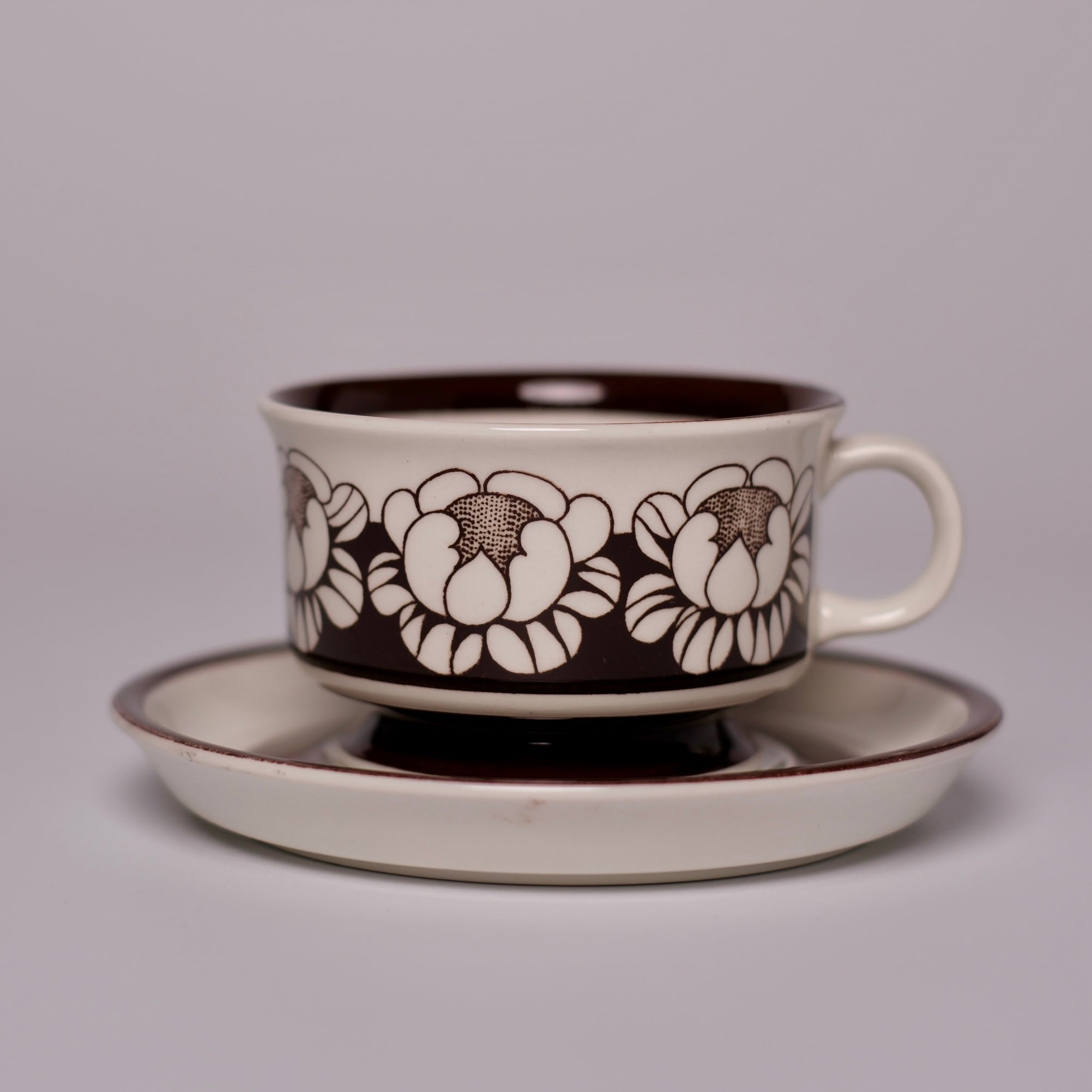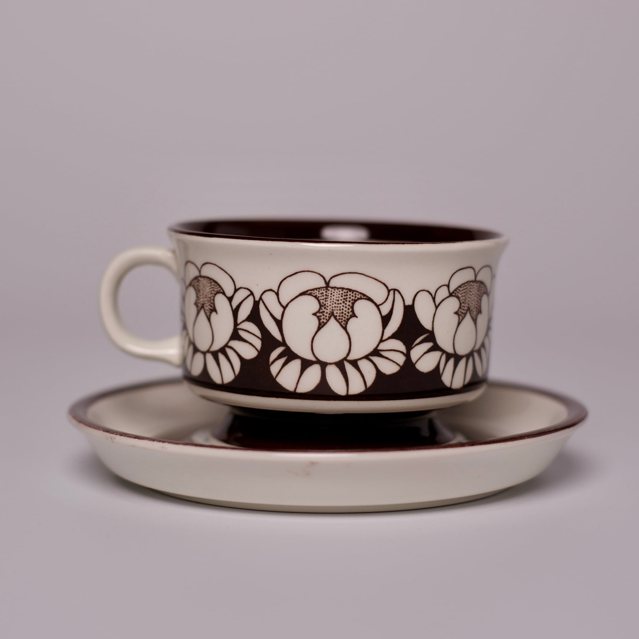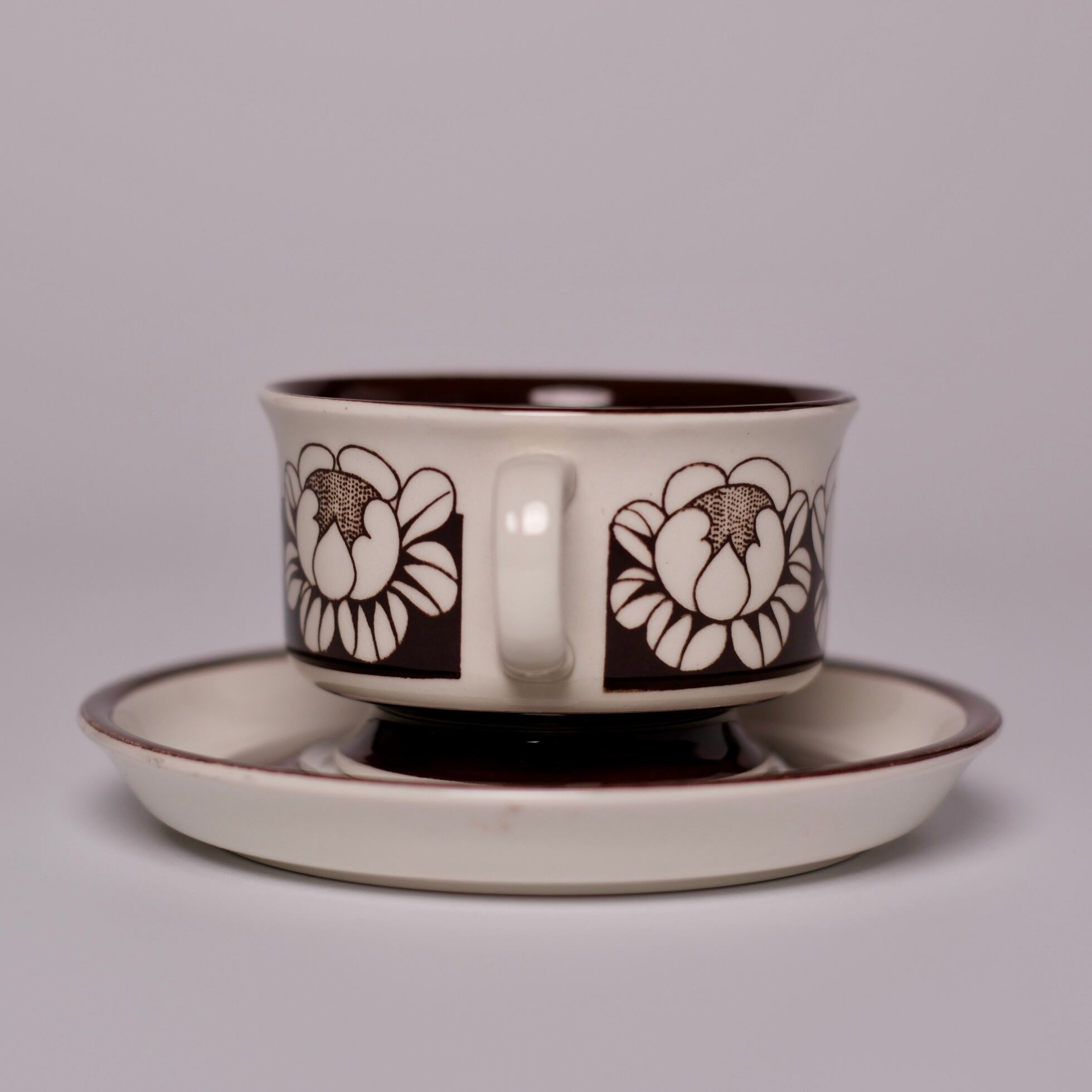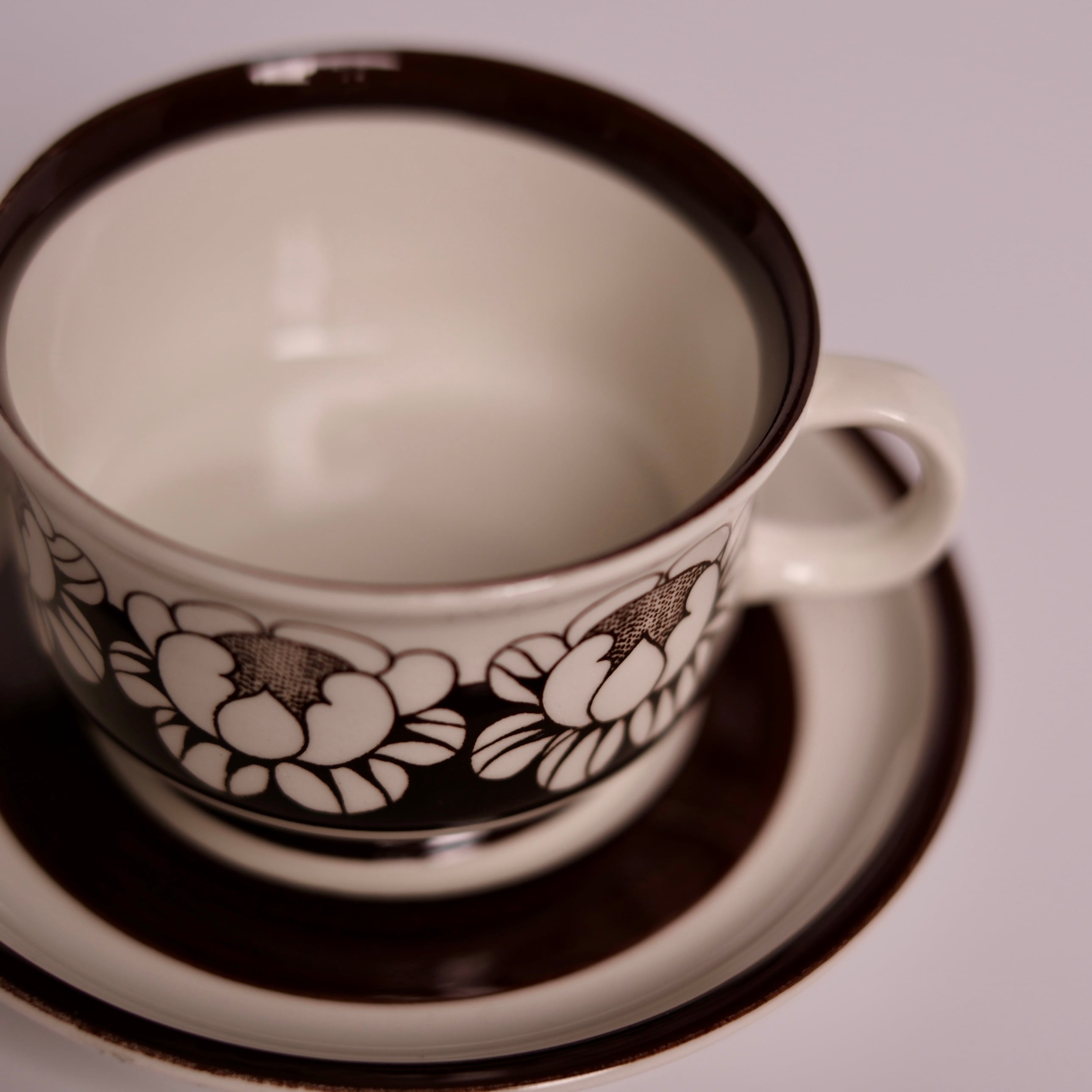 チョコレートブラウンで描かれた、ハスの花を思わせる大ぶりな花模様が印象的な、Katrilli(カトリーリ)のデミタスカップ&ソーサー。