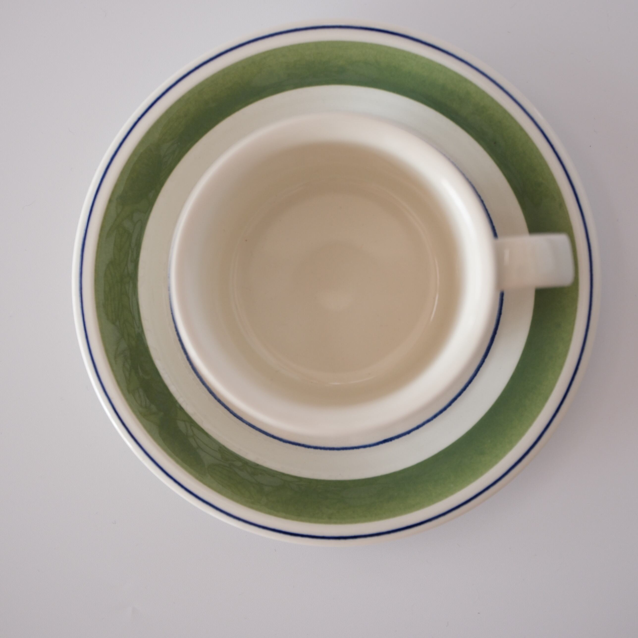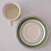 ソーサーには淡いグリーンの帯と、その内外に引かれたブルーの細いライン。