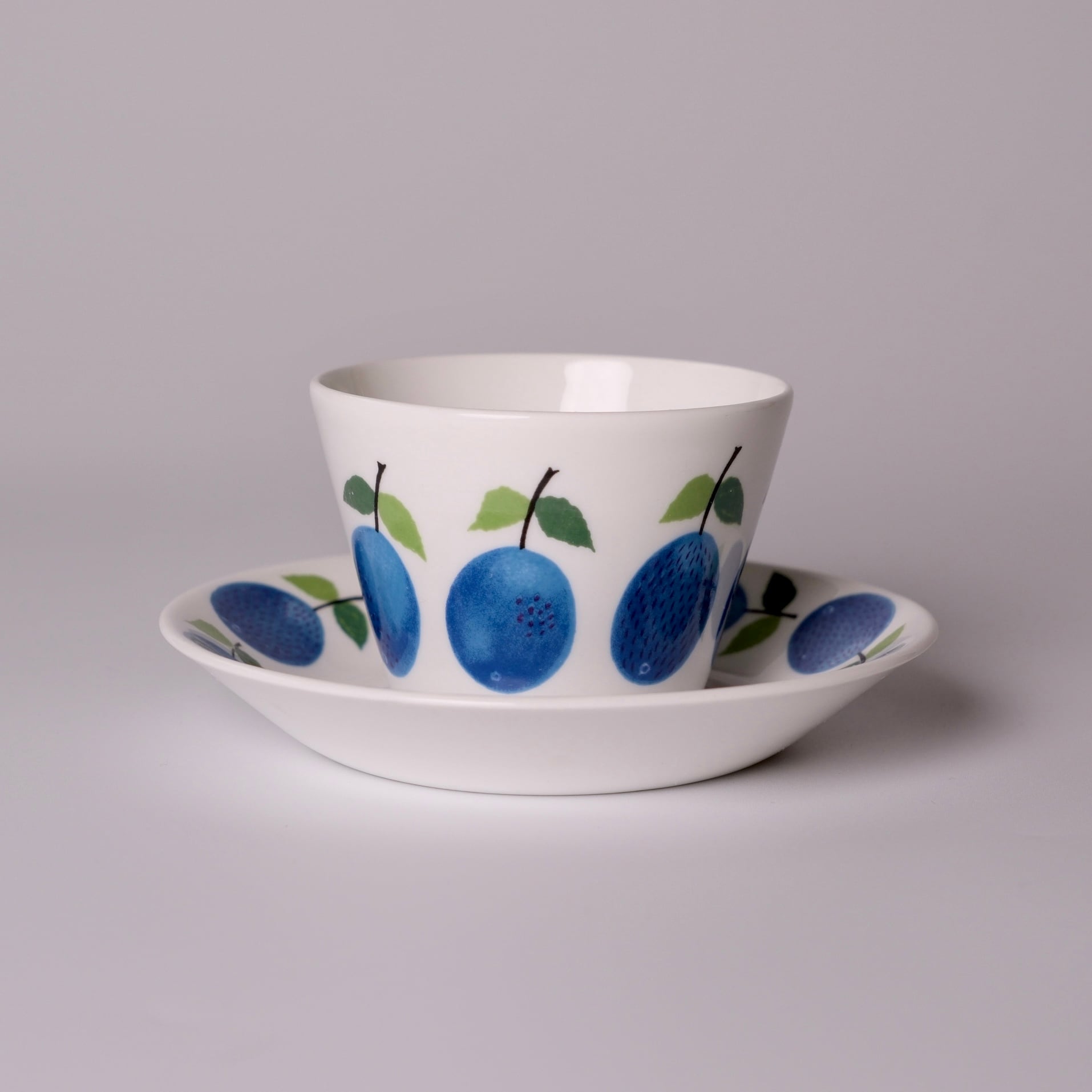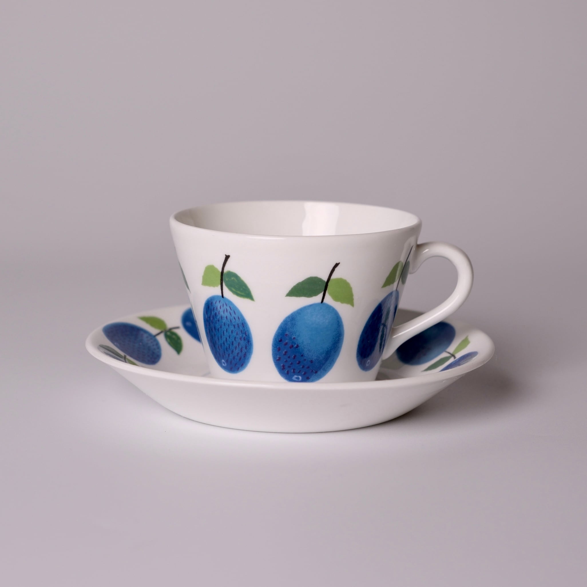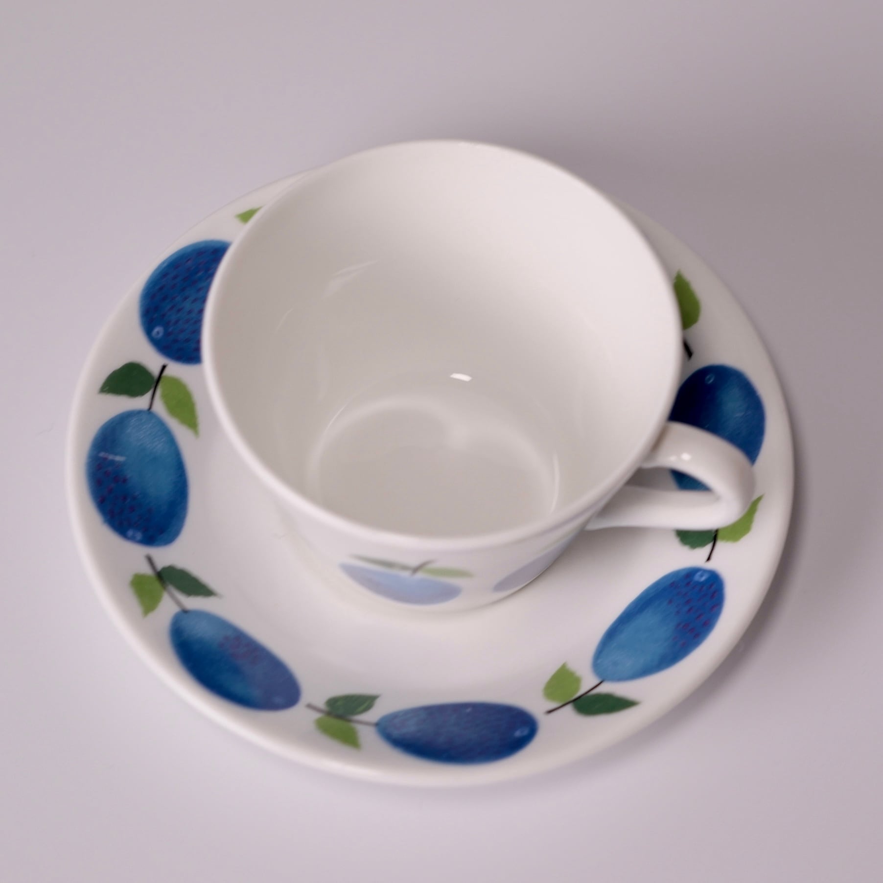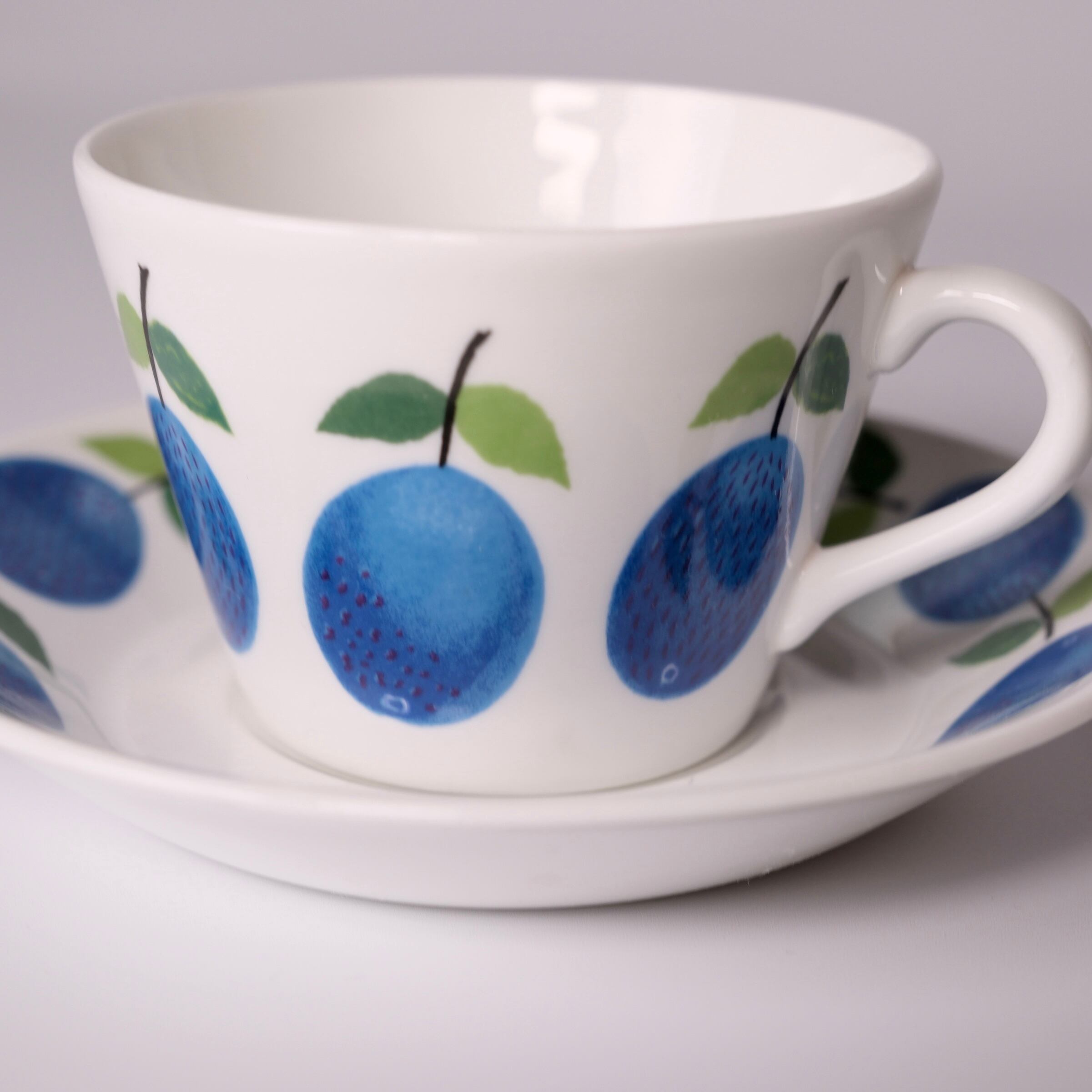 鮮やかな青のプラムと、葉のやわらかな緑色が、温かみのあるボーンチャイナの乳白色の素地によく映えます。