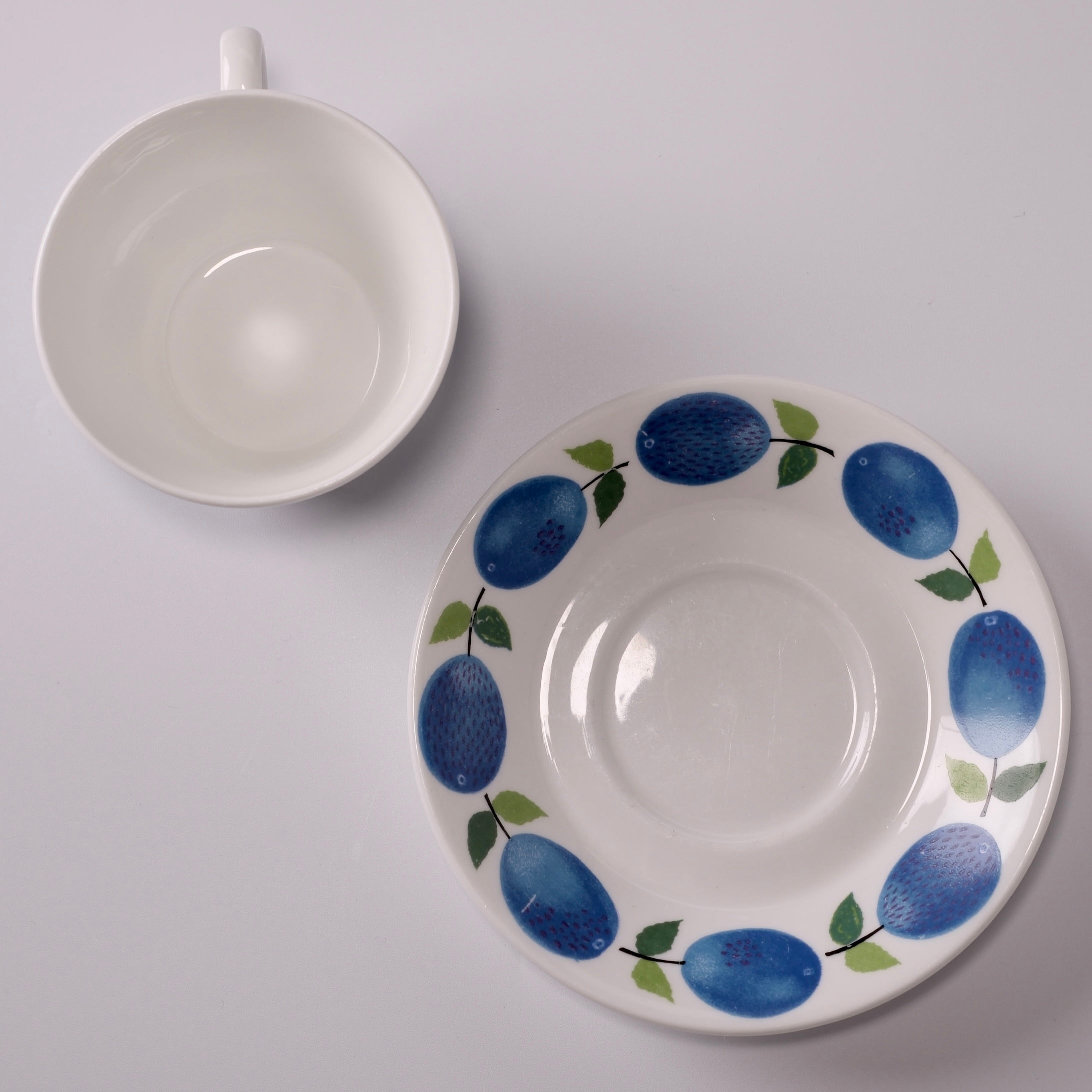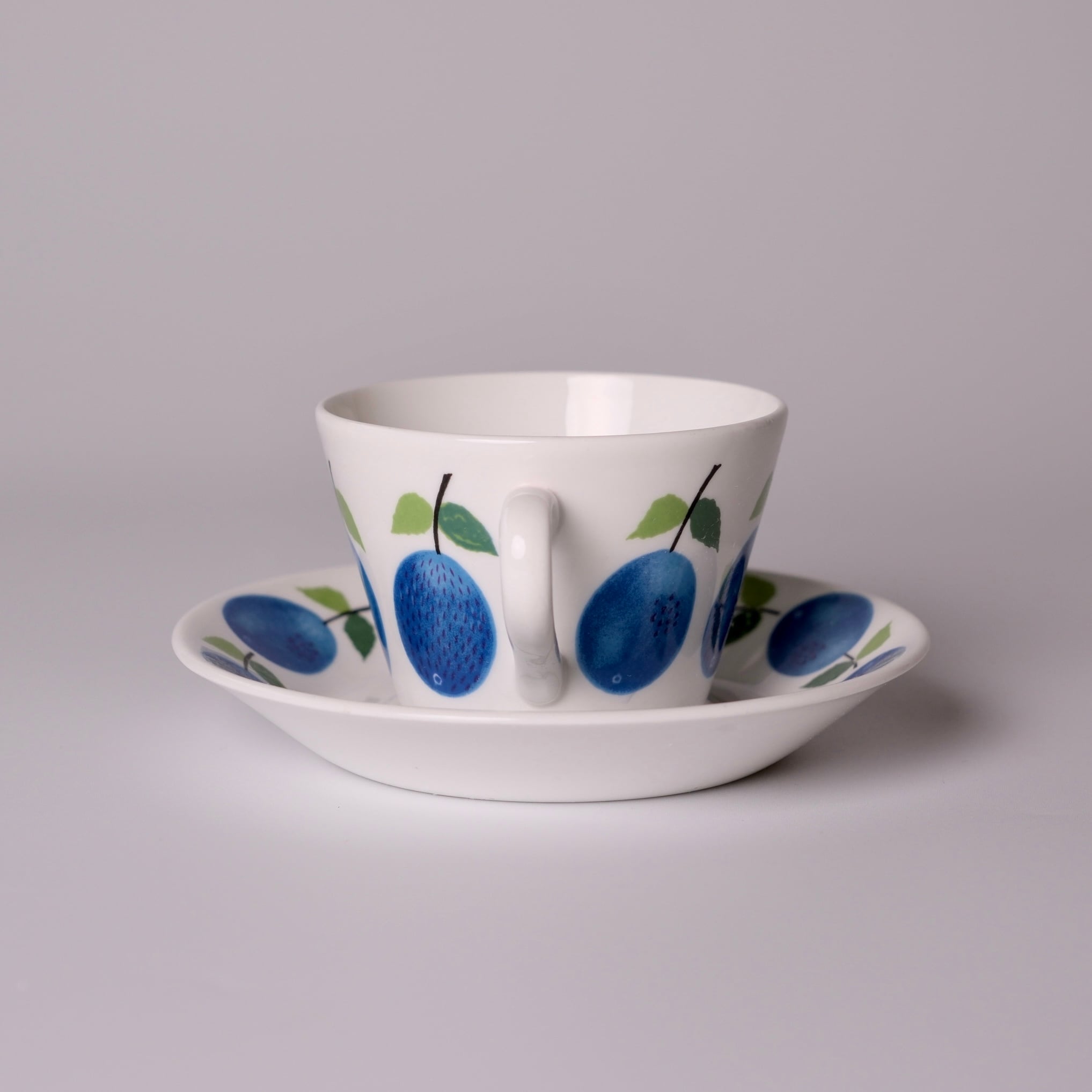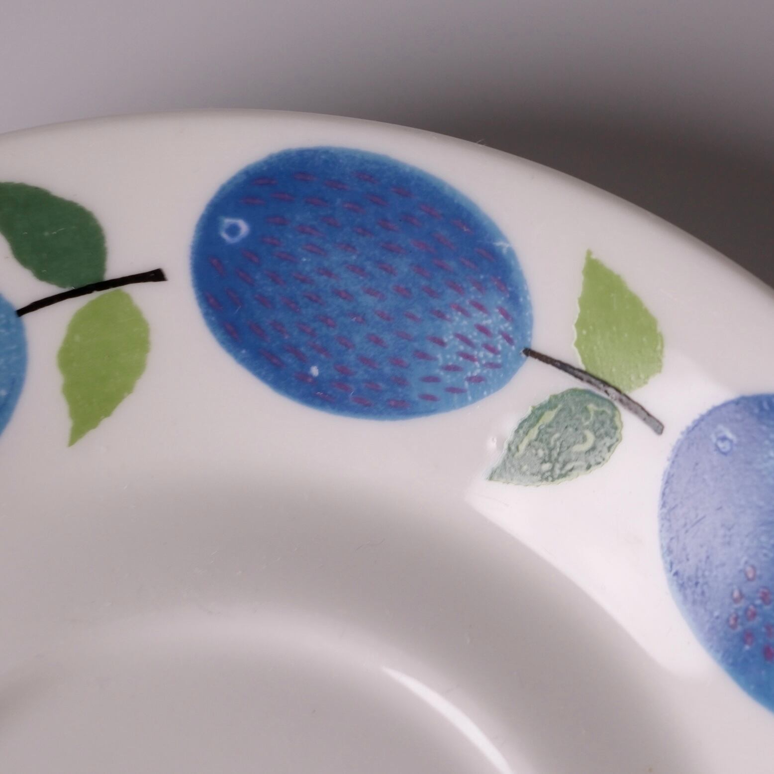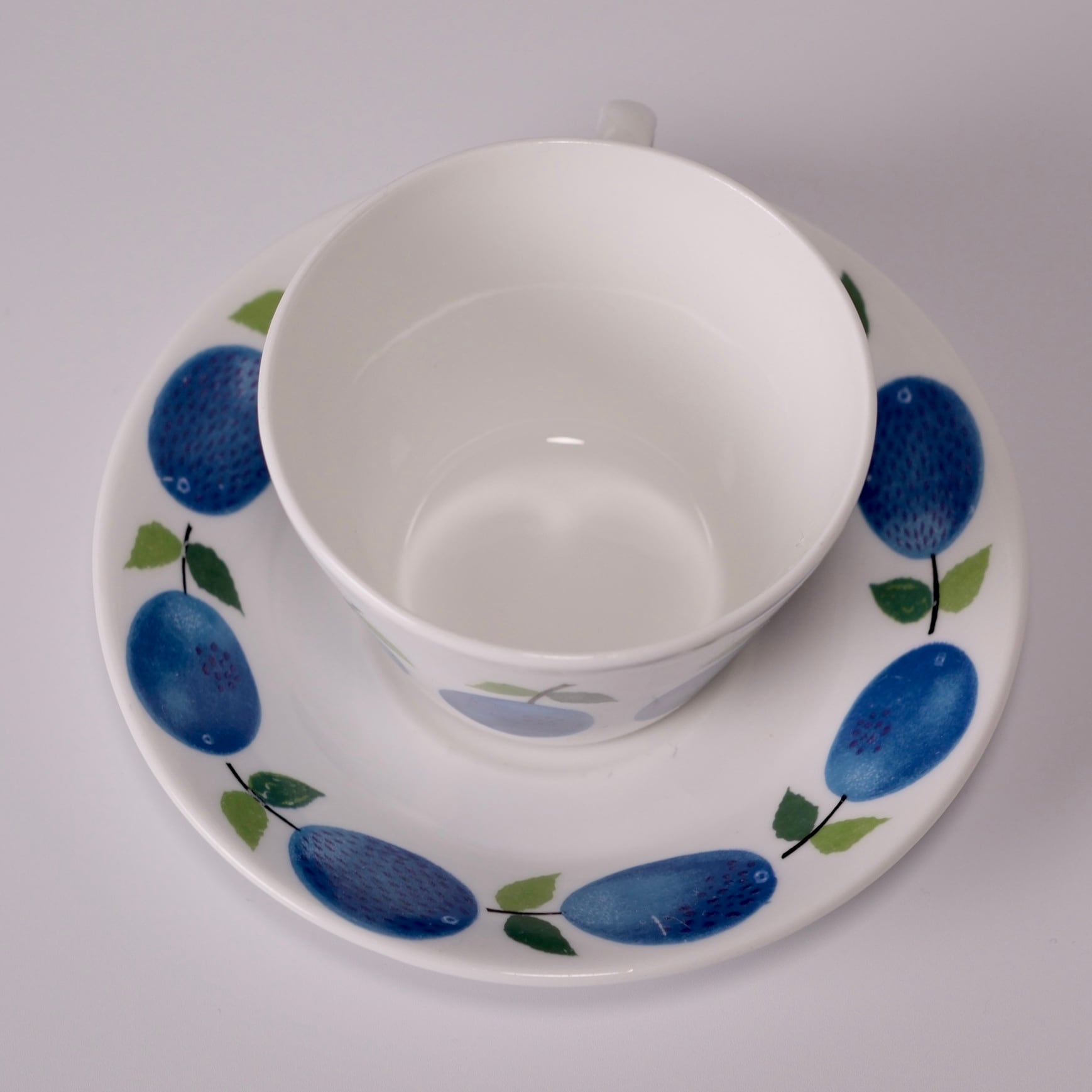 鮮やかな青のプラムと、葉のやわらかな緑色が、温かみのあるボーンチャイナの乳白色の素地によく映えます。