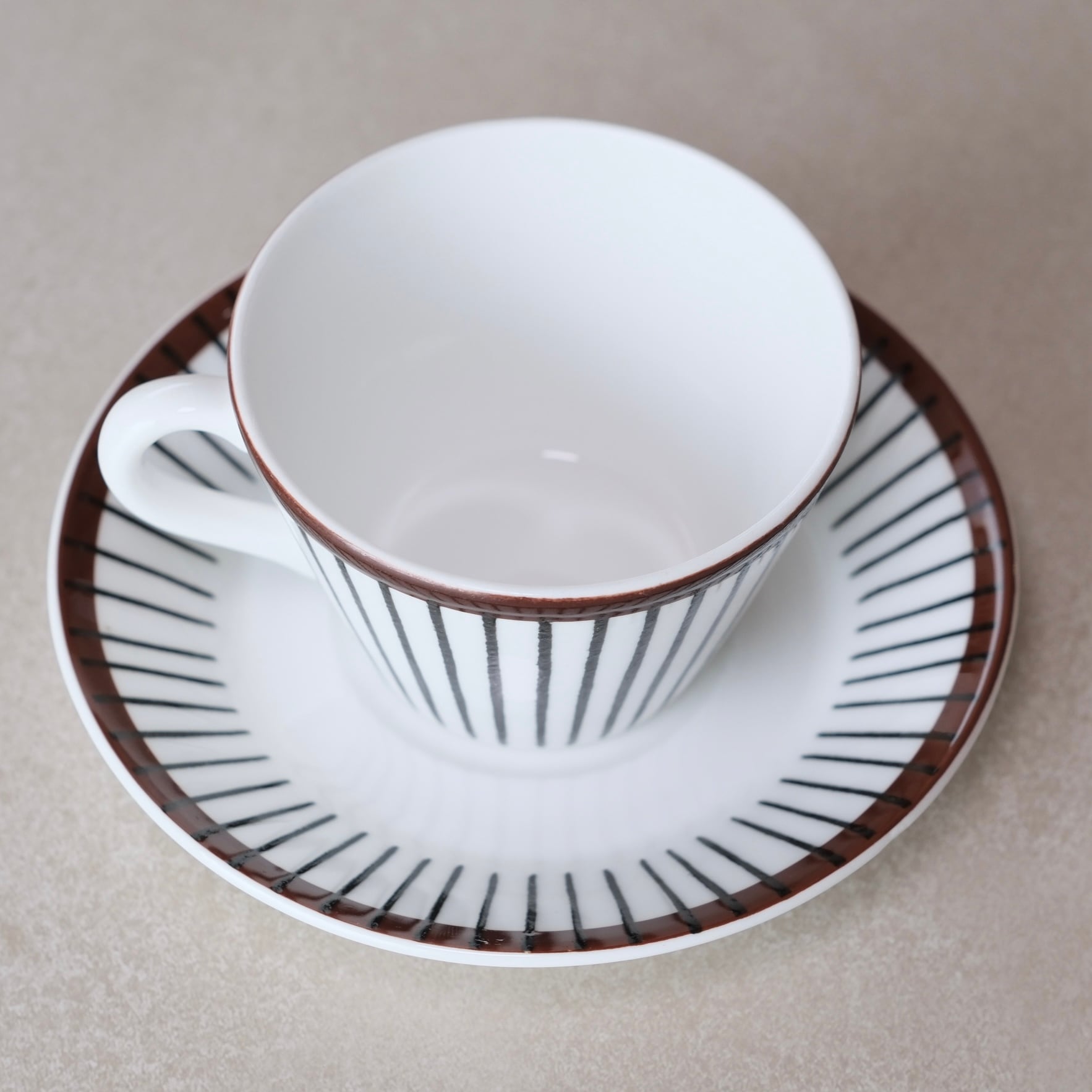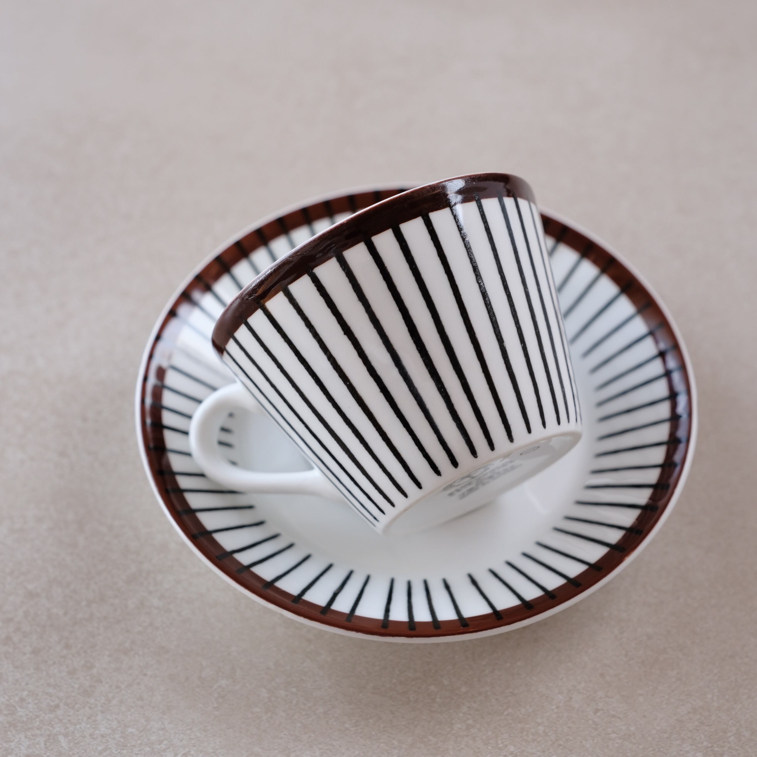 白地に引かれた黒い縦のストライプと、縁を巡るあたたかなブラウンのライン。