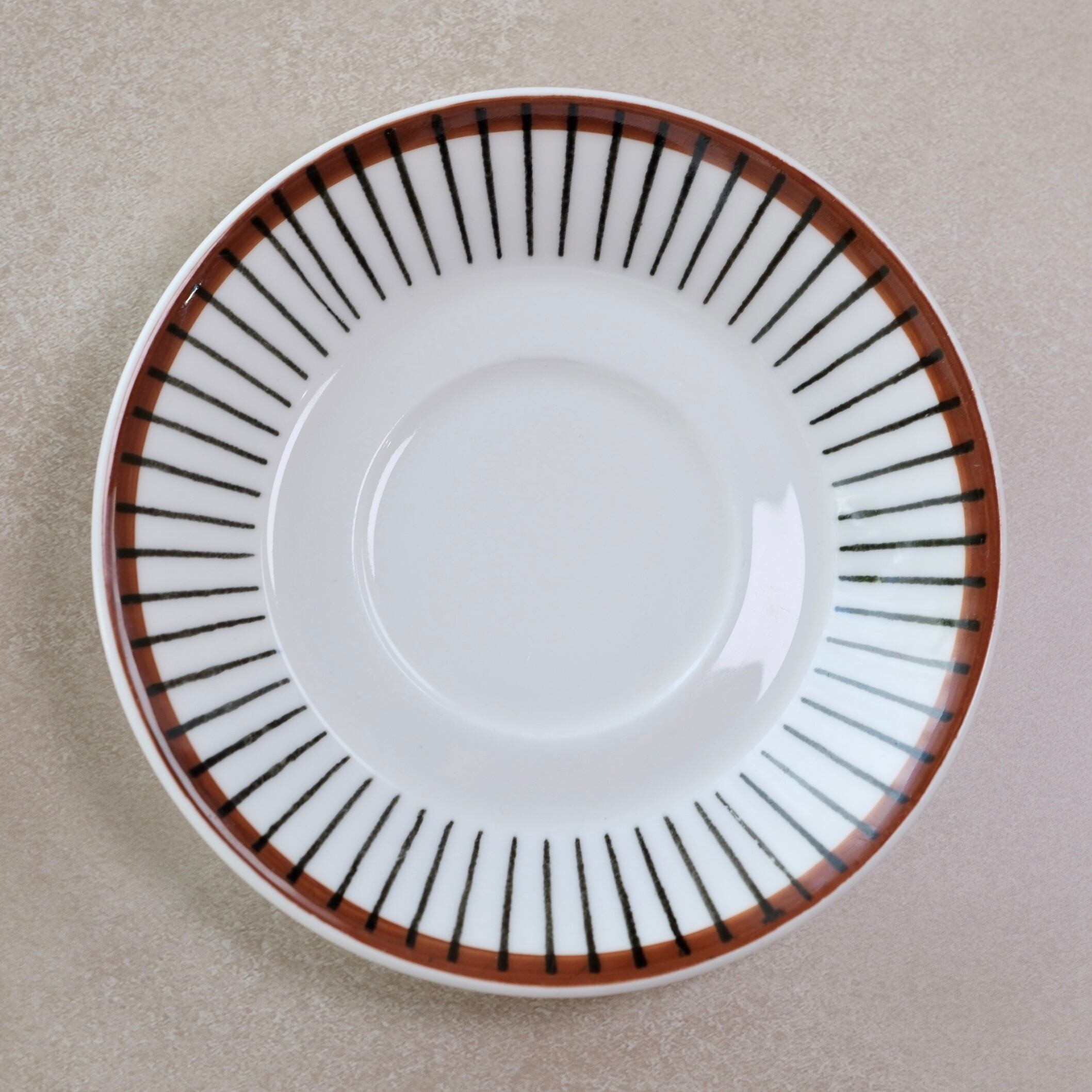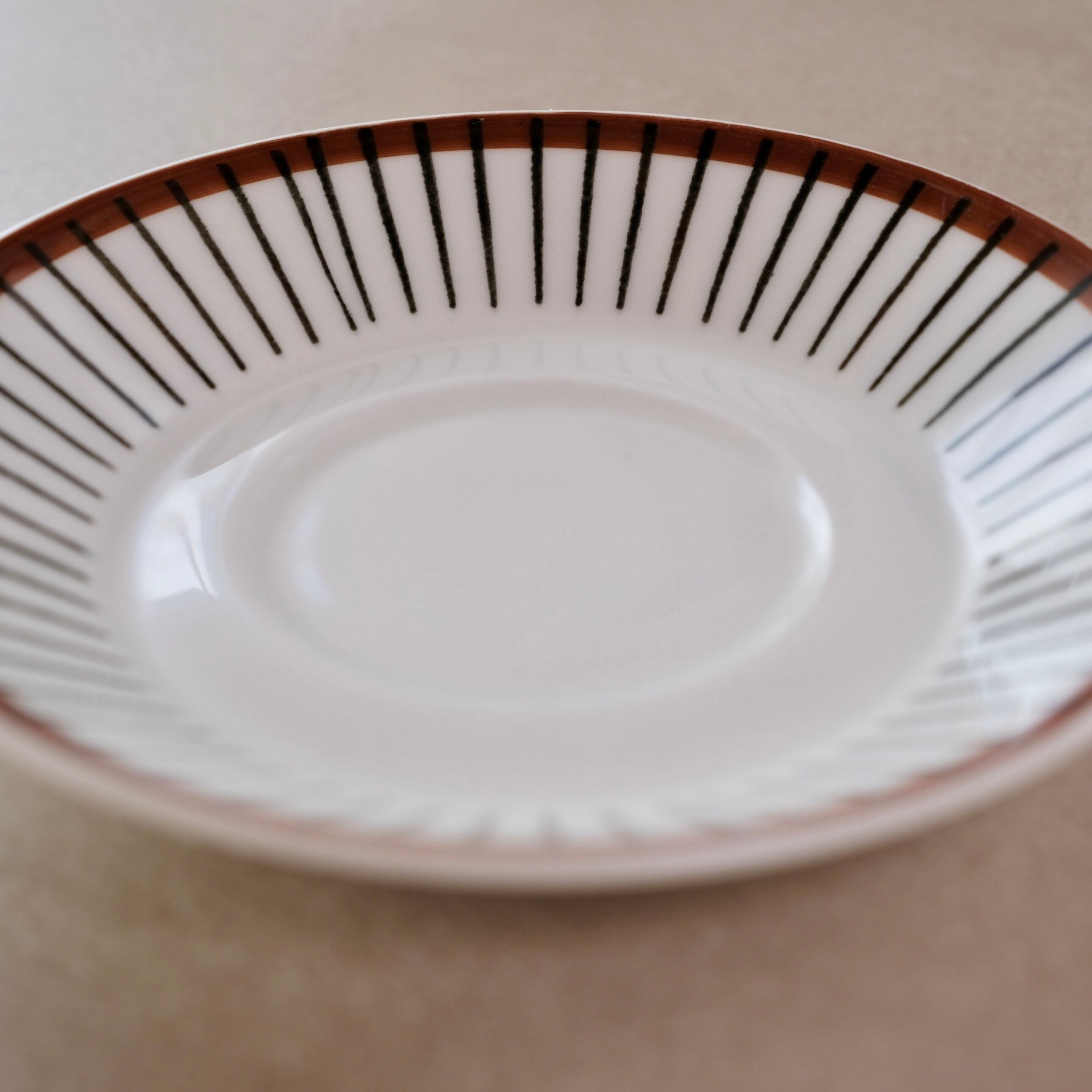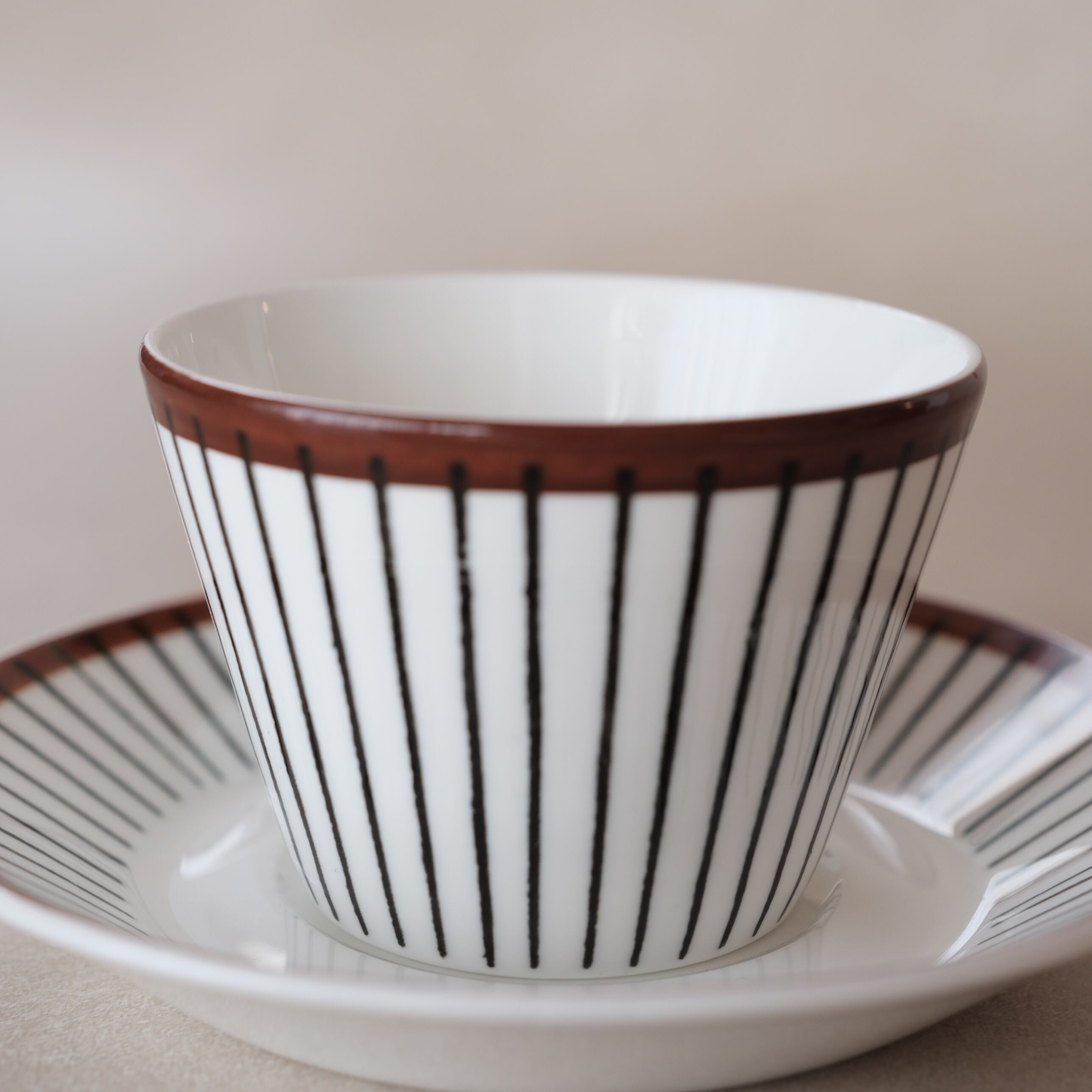 白地に引かれた黒い縦のストライプと、縁を巡るあたたかなブラウンのライン。