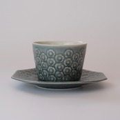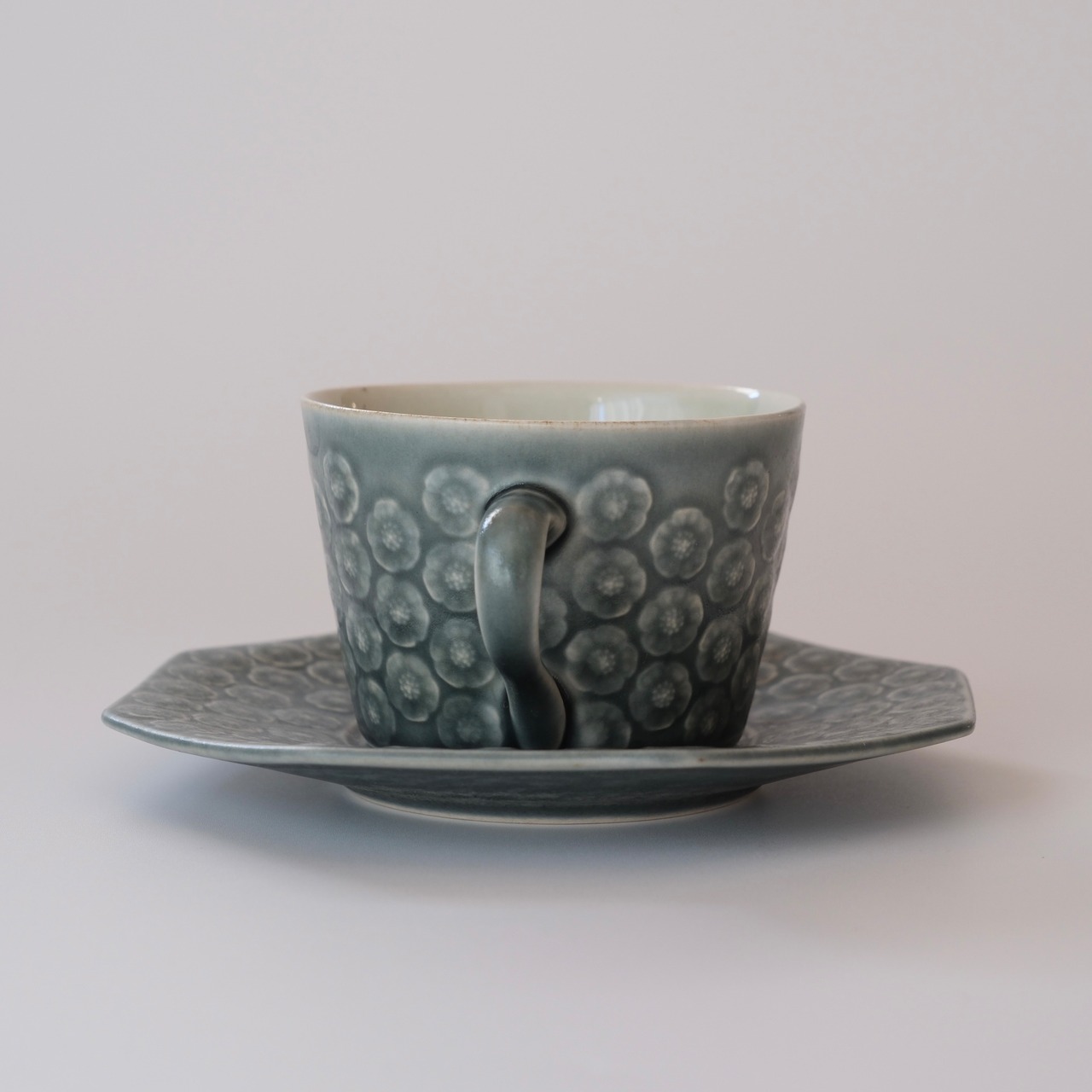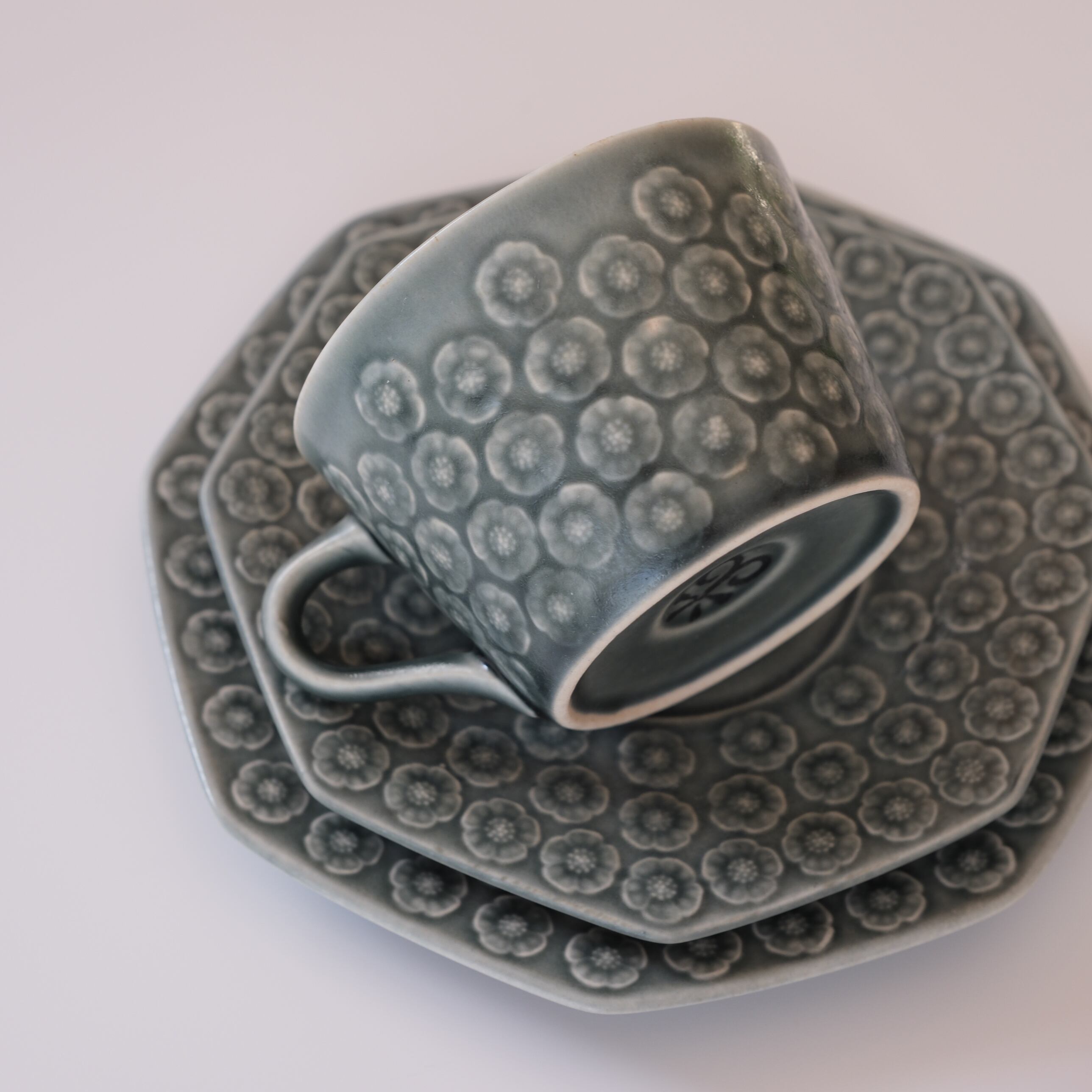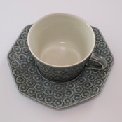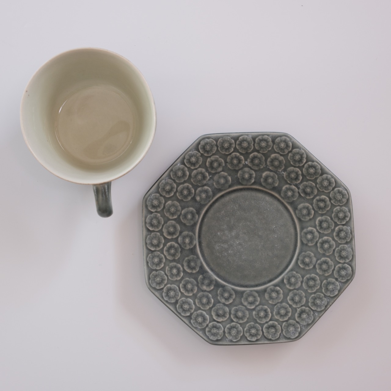 すっきりとしたフォルムのカップと、エッジの効いた八角形のソーサー。