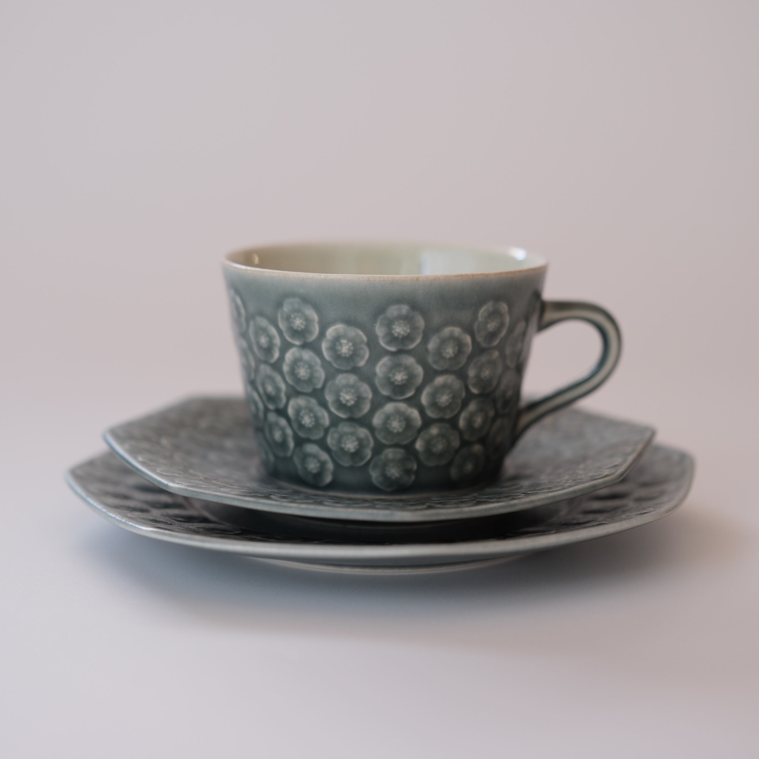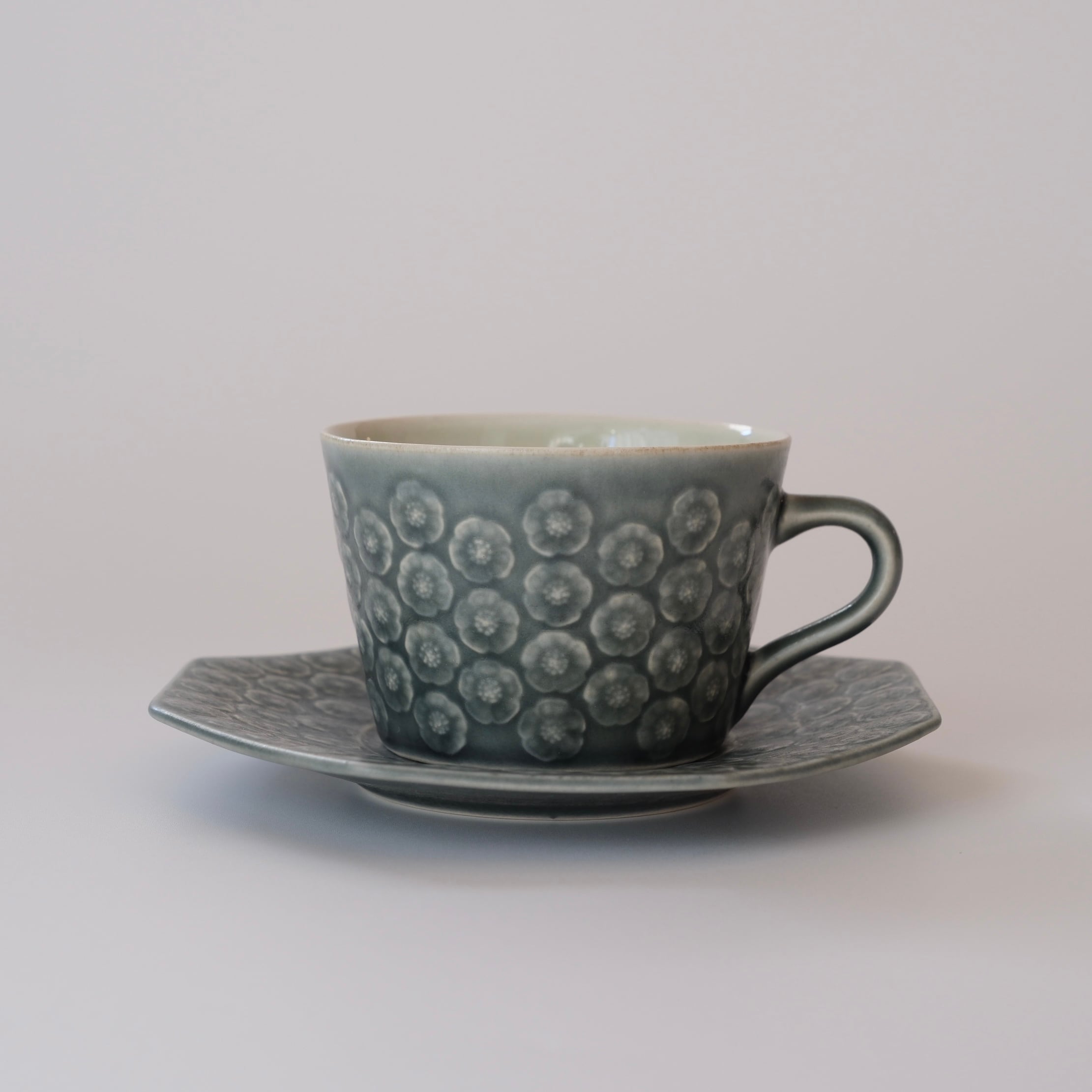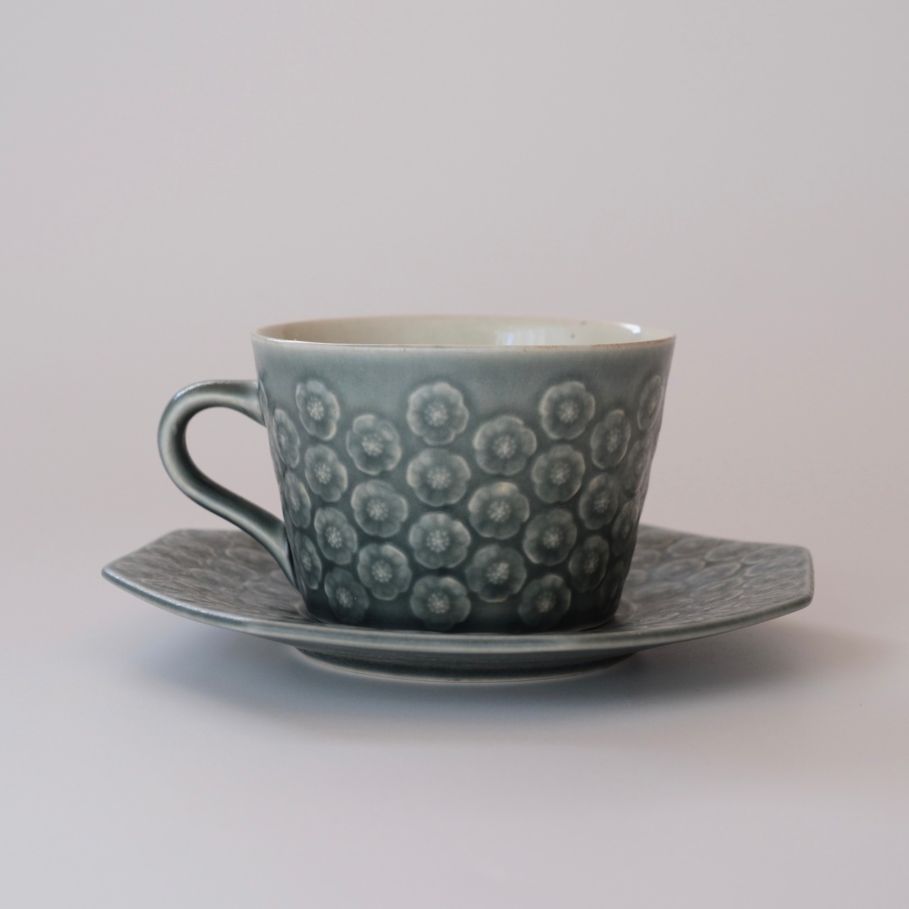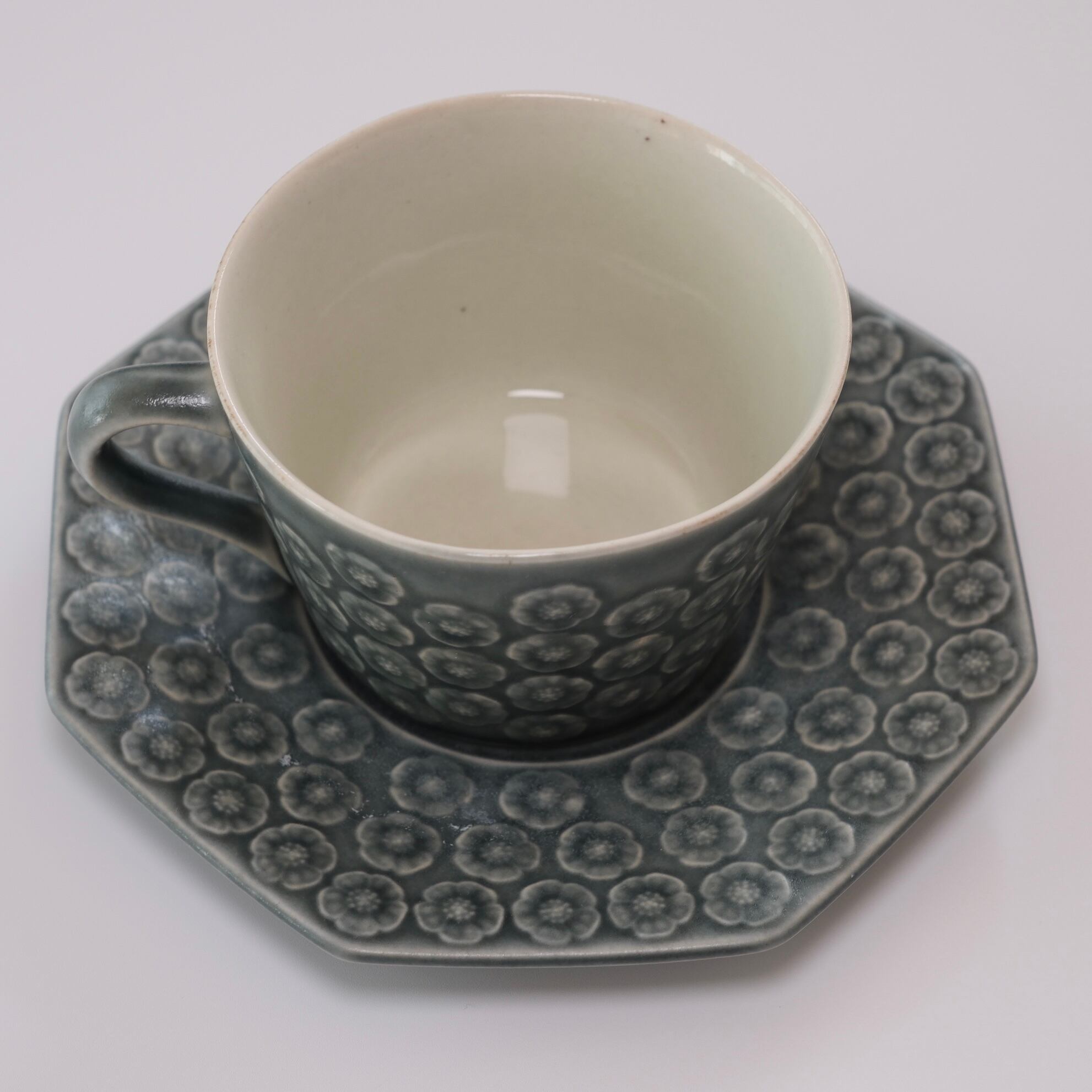 すっきりとしたフォルムのカップと、エッジの効いた八角形のソーサー。