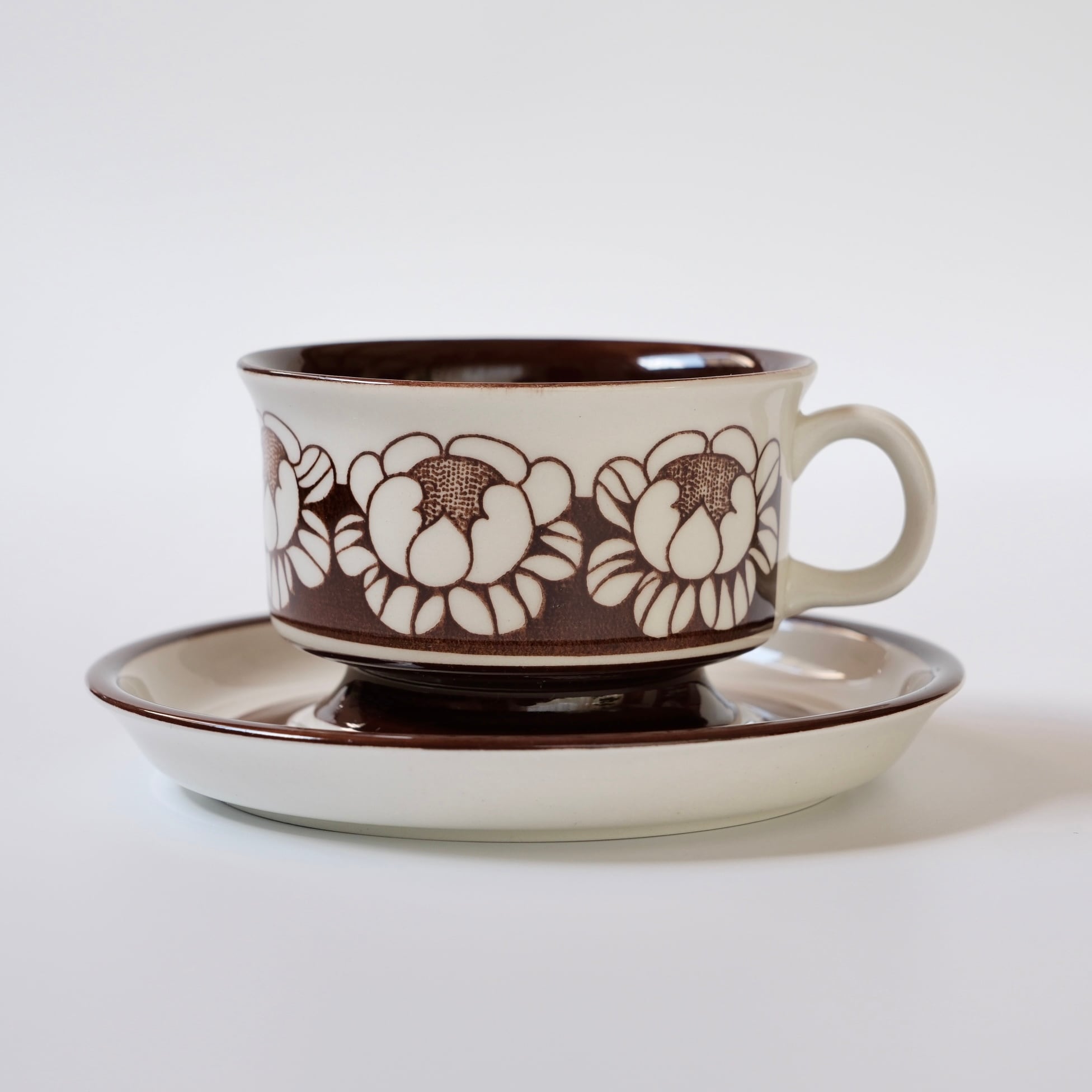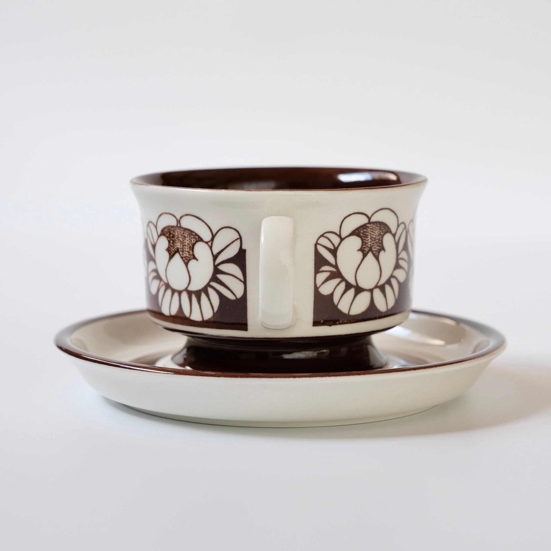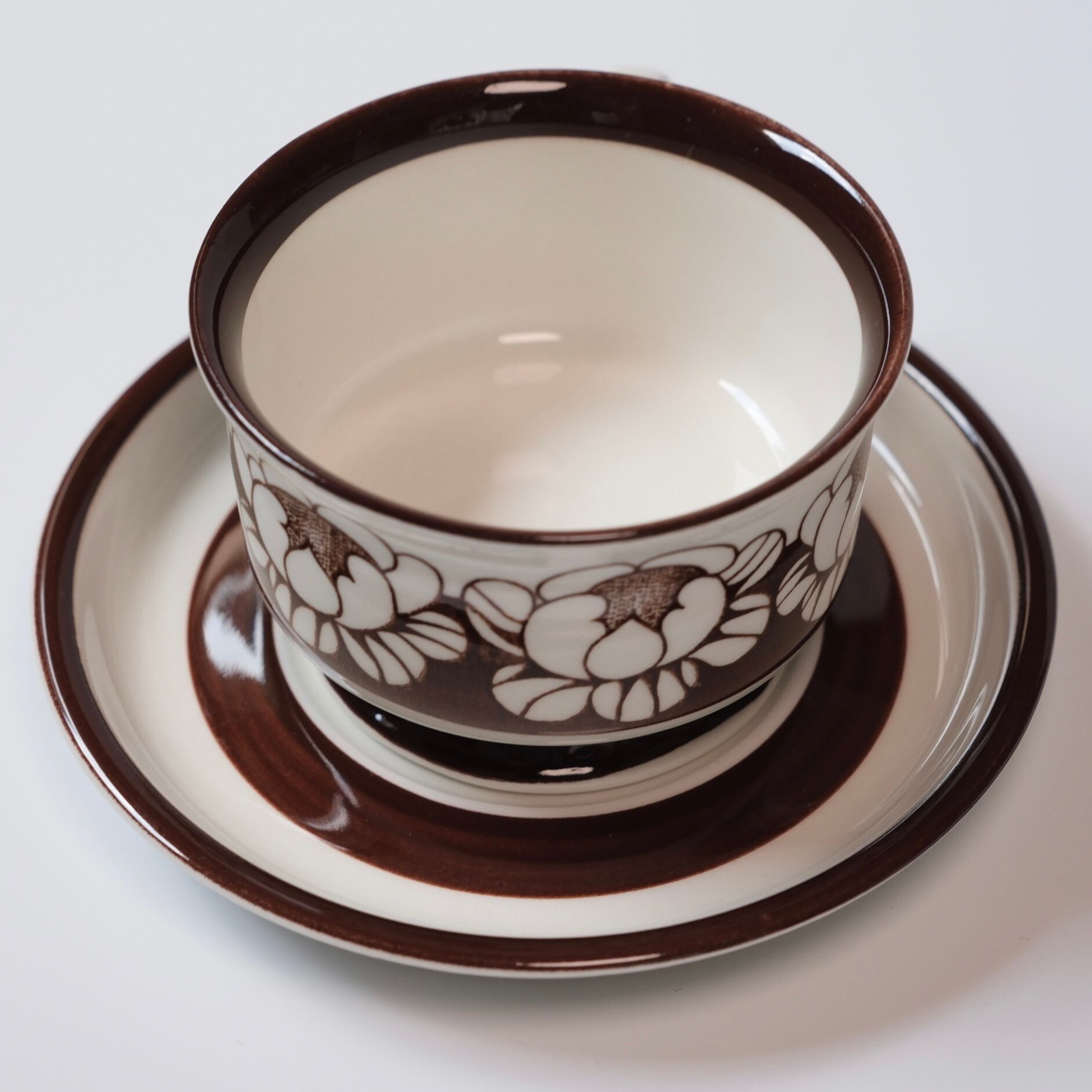 チョコレートブラウンで描かれた、ハスの花を思わせる大ぶりな花模様が印象的な、